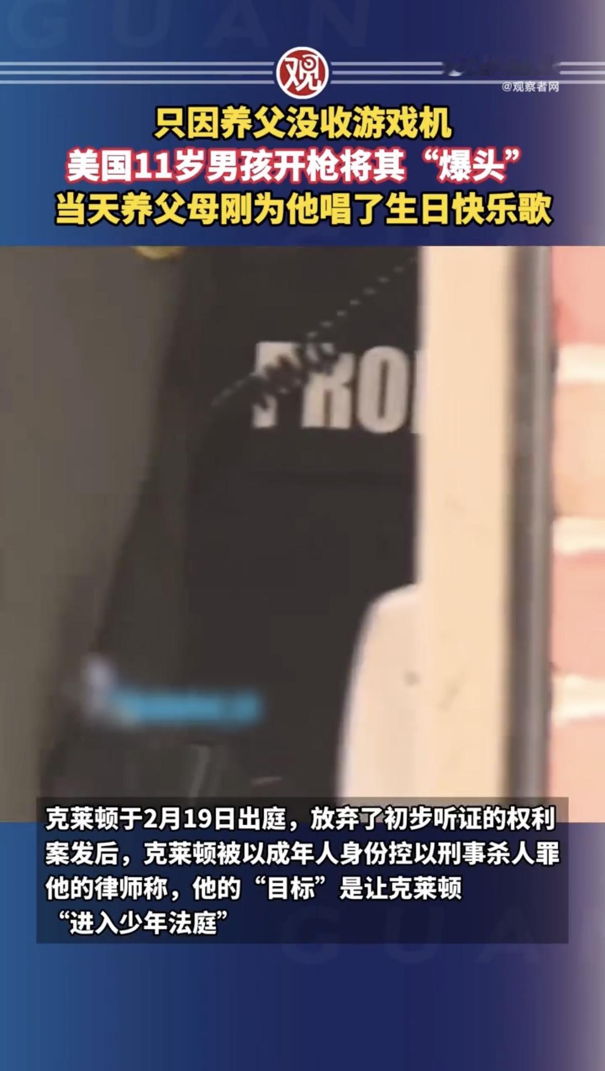 美国一个11岁的男孩,在生日那天,因为游戏机被没收,竟然开枪打死了自己的养父。就在几个小时前,养父母还刚给他唱完生日快乐歌。 这件事最让人心惊的地方,是男孩面对警察询问时的反应。警察问他,扣动扳机的时候,想过后果吗?孩子很平静地说:当时太生气了,没想过这个问题。 听听,没想过。一个11岁的孩子,已经能熟练地从保险箱里拿枪,熟练地扣动扳机,却“没想过”这一枪下去意味着什么。 当一个社会把拥有枪支当成天经地义,把用枪解决问题当成理所当然,就别怪孩子有样学样。 心疼这对夫妻,他们2018年收养了这个孩子,给了他家,给了他爱,最后却死在他的枪下。而男孩呢?他可能到现在都不明白,自己到底失去了什么。