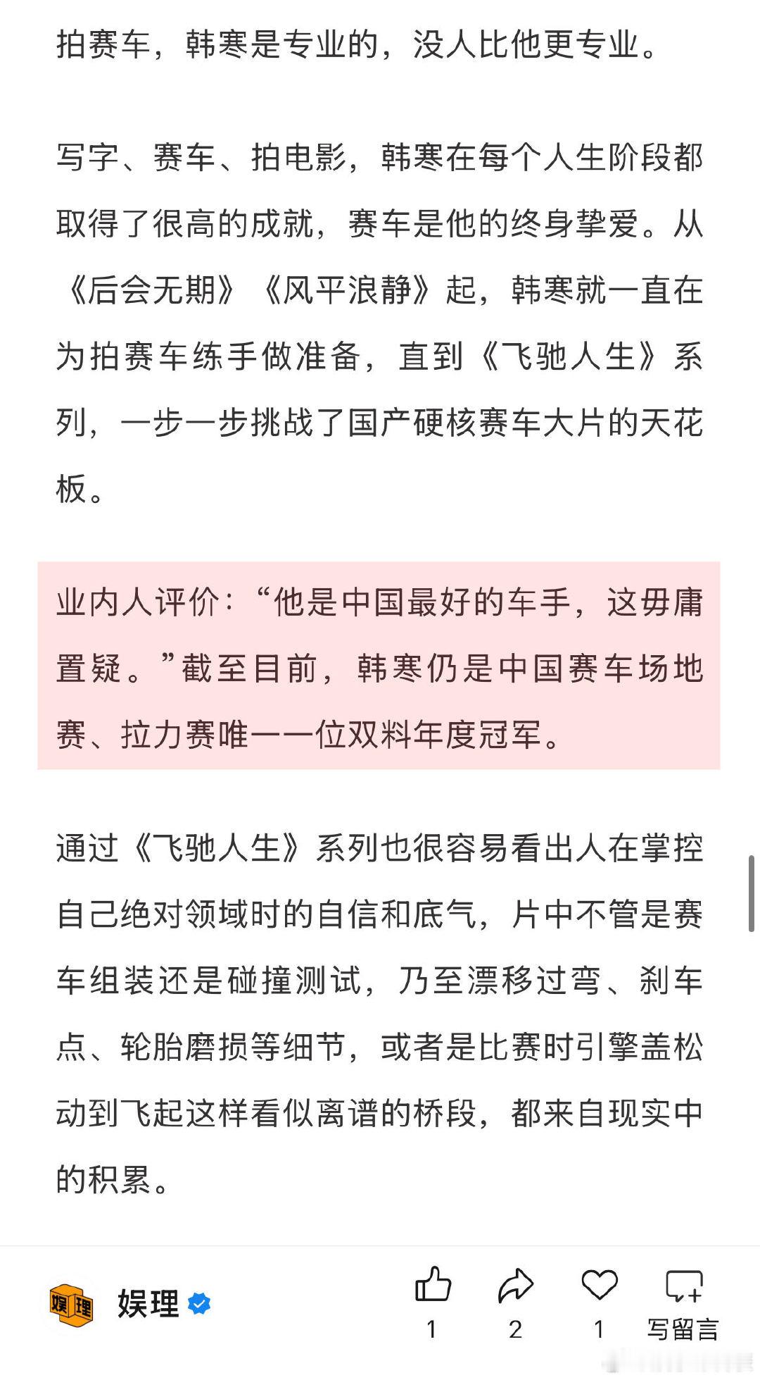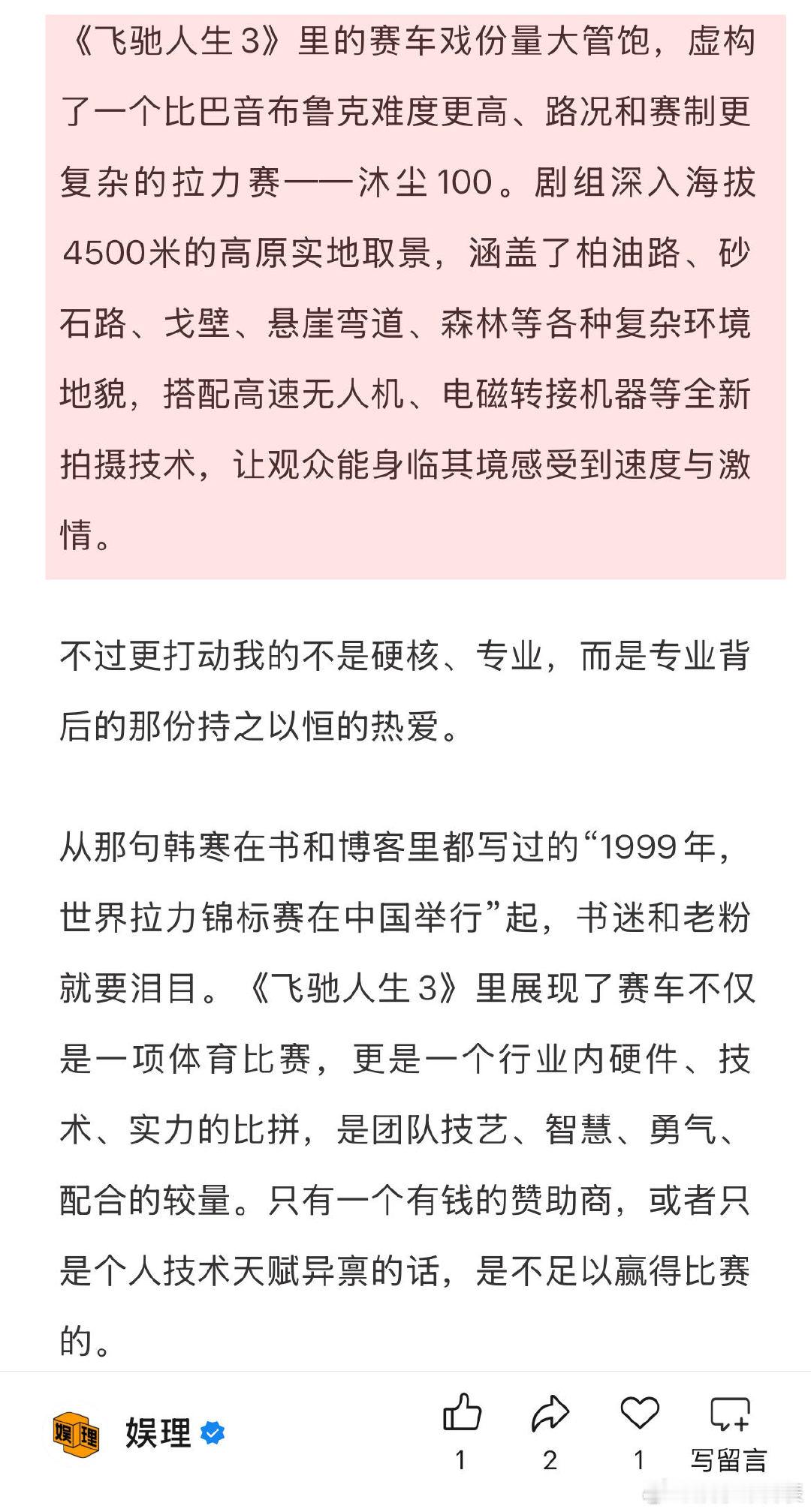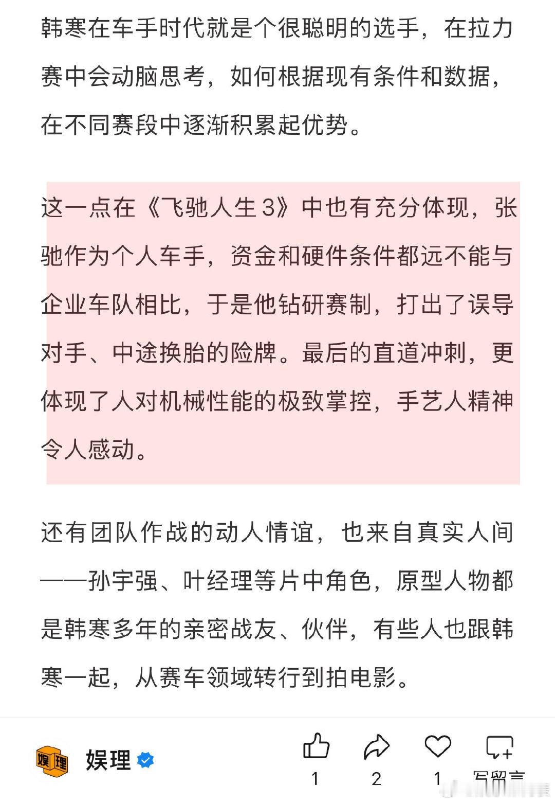 飞驰人生3手搓手艺人 飞驰人生3沈腾的对手是AI 韩寒在车手时代就是个很聪明的选手,这一点在《飞驰人生3》中也有充分体现:张驰作为个人车手,资金和硬件条件都远不能与企业车队相比,于是他钻研赛制,打出了误导对手、中途换胎的险牌。最后的直道冲刺,更体现了人对机械性能的极致掌控,手艺人精神令人感动。娱理独家↓