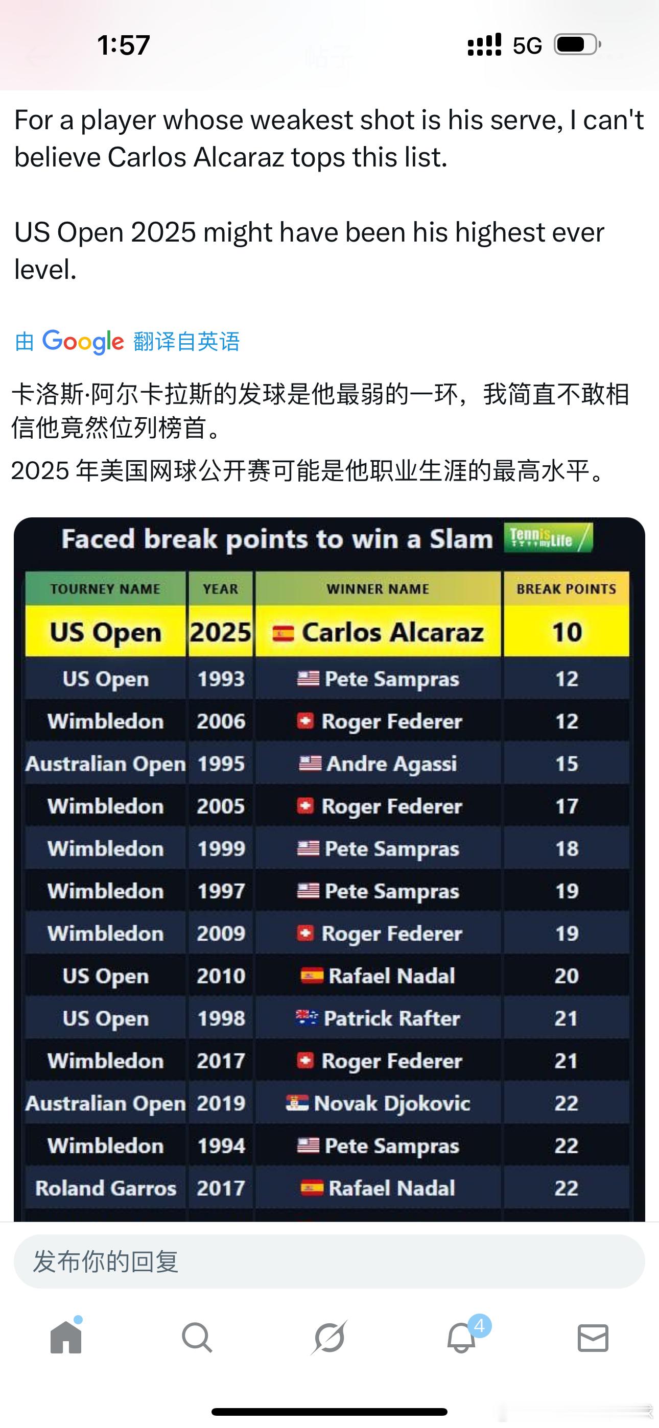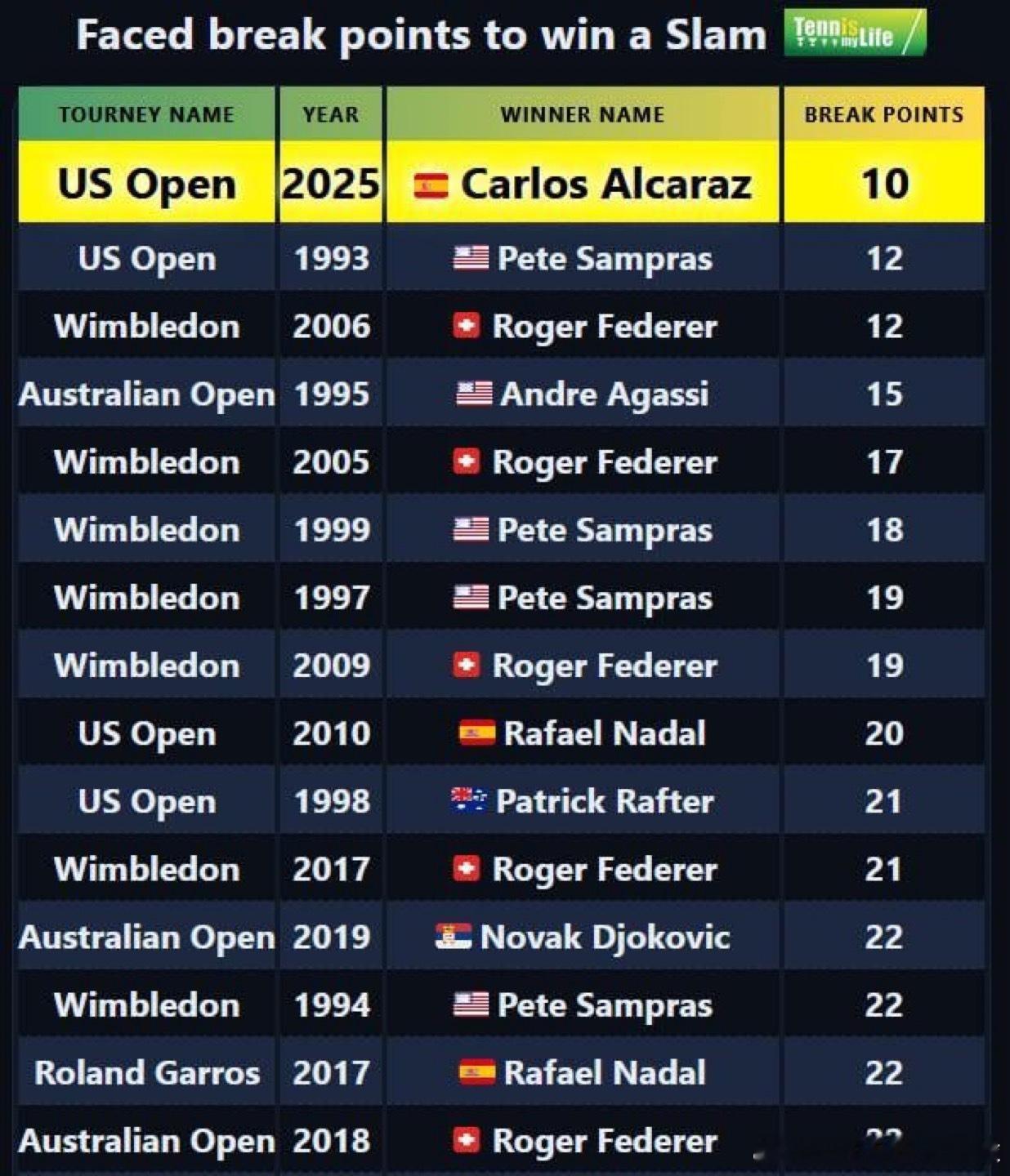 拿下一座大满贯面临的破发点数据,阿尔卡拉斯去年美网仅仅被对手拿到10个破发点排名第1!外推网友表示发球算是他比较弱一环,难以置信;
