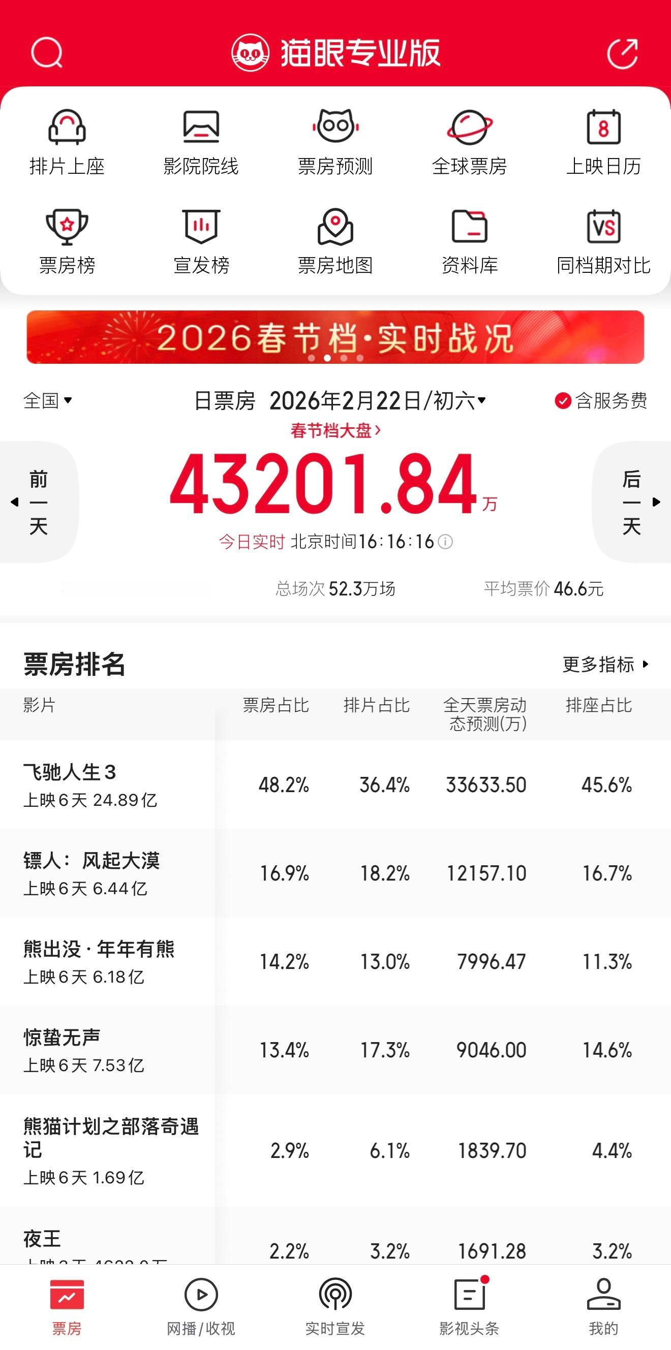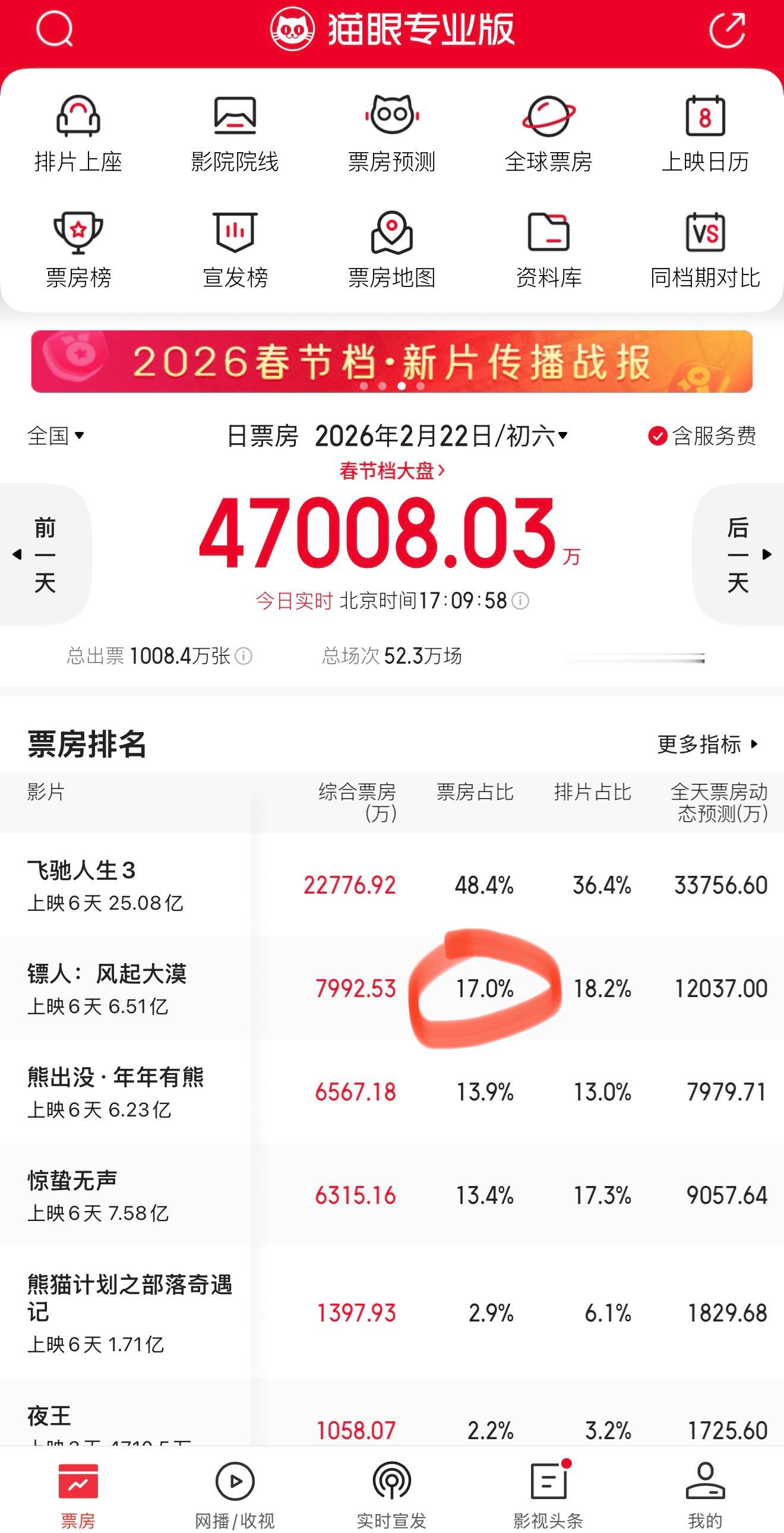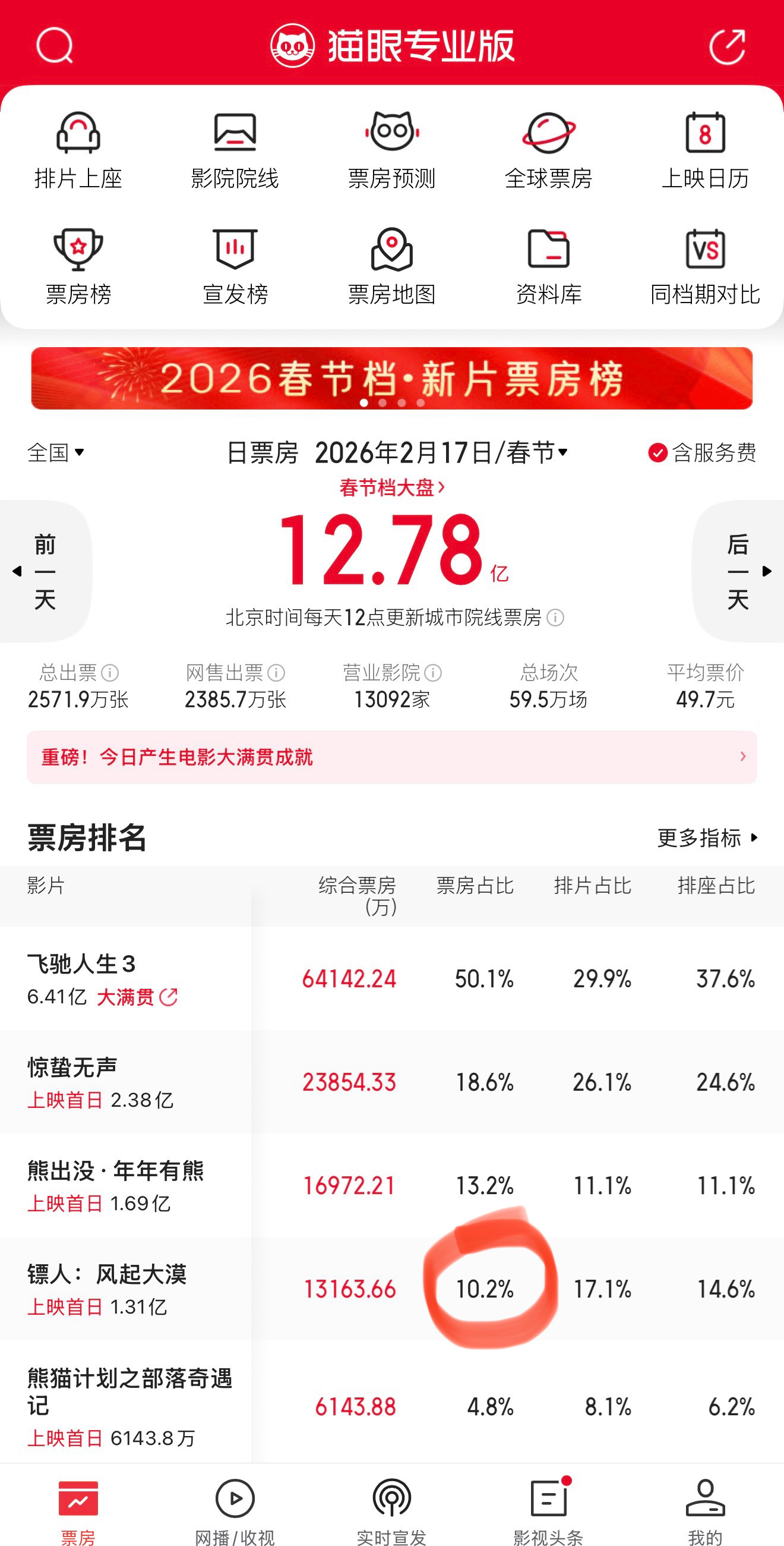镖人排片一直在升 其实从初四开始镖人排座比和票房就已经开始正挂了,我们大蠕排片也蠕动上升了。今天如果票房达到预测1.2亿,那就是连续四天逆跌且票房都过亿 以及票房占比总10.2%上升到17%怎么不能夸!