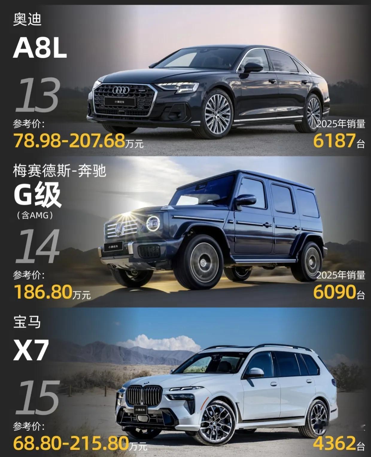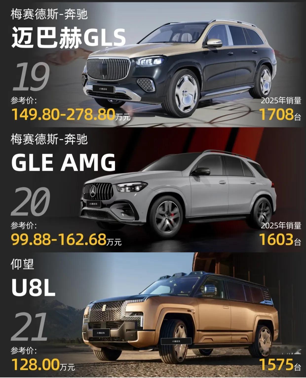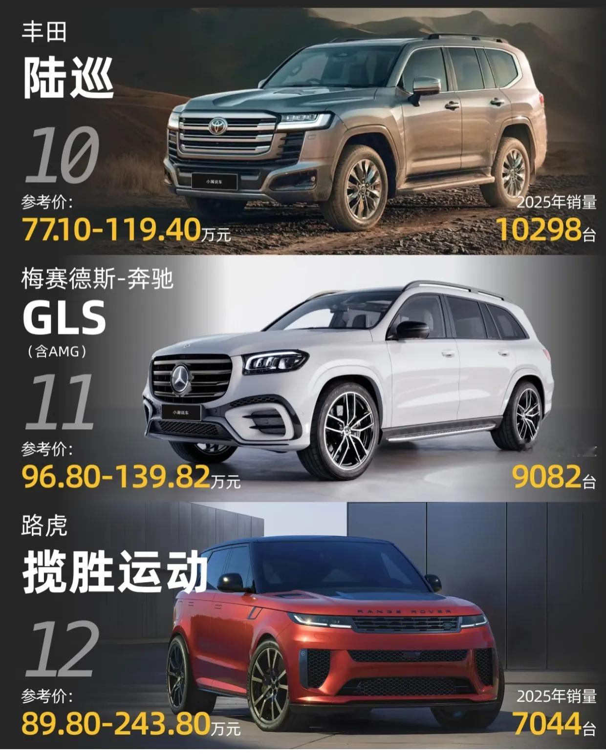 2025年的100万+豪车销量排行榜,传统豪华品牌(奔驰、宝马、迈巴赫)仍绝对垄断,SUV是主流!