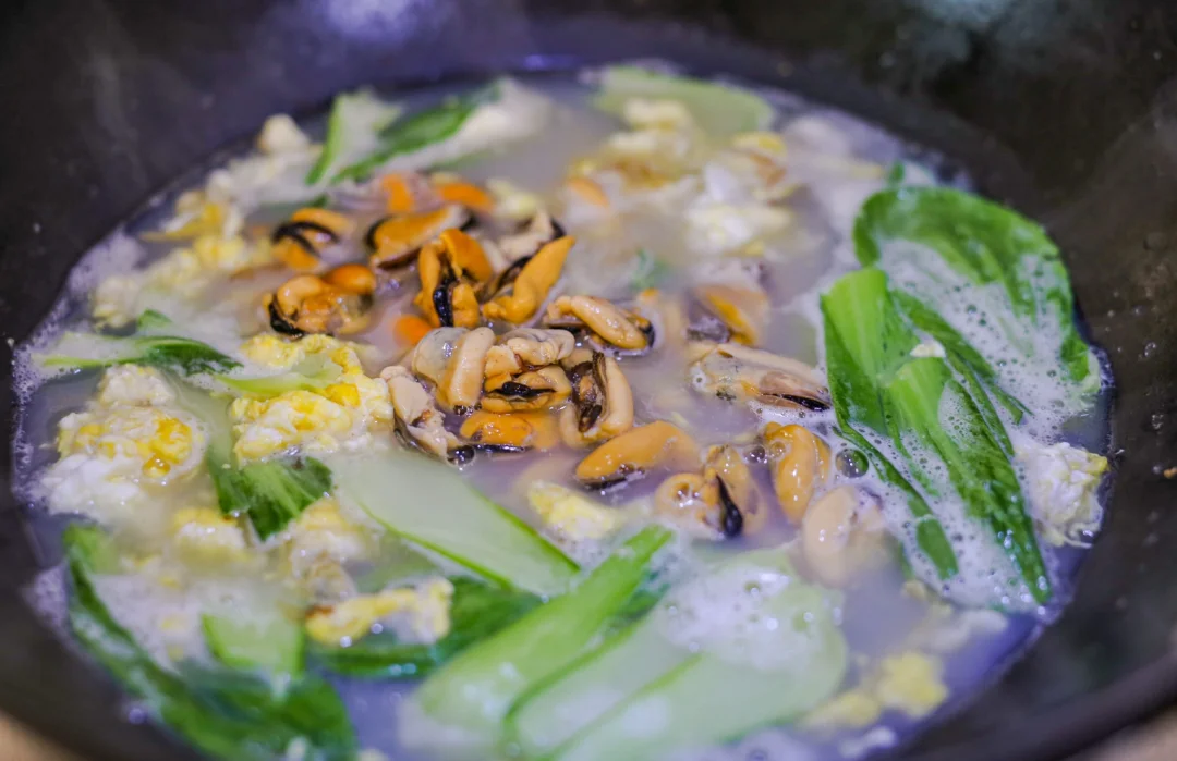 🌟2.清洗干净海虹之后,放入锅中,放一丢丢水或者不放都可以,盖上锅盖煮到开口就行,把煮海虹的汤过滤掉,一会儿我们可以下面条或者米线用。