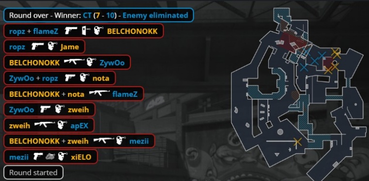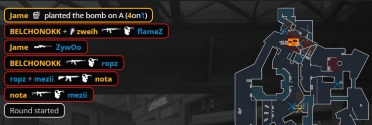 第10回合ropz手雷炸飞下水道口zweih,KK反杀ropz,PV在B扔出259烟,小蜜蜂进点刷屏杀掉PV三人,小蜜蜂拿到第6分。
