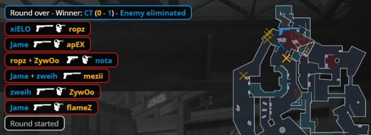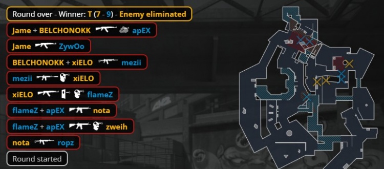 第21回合ropz反摸下水道打掉nota,上帝大狙A大对位轰掉Zywoo,KK进点双杀,上帝下包,PV拿到第9分。