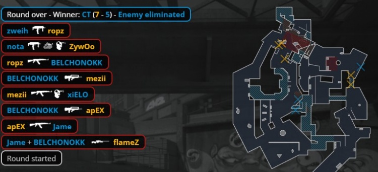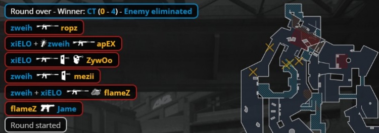 第5回合长枪局,Zywoo无甲进攻大狙,apex短管混烟先杀KK,火仔气球旁打掉xiELO,上帝绕屁股来A打掉Zywoo,但正面nota与zweih被杀,上帝保住大狙,小蜜蜂拿到首分。