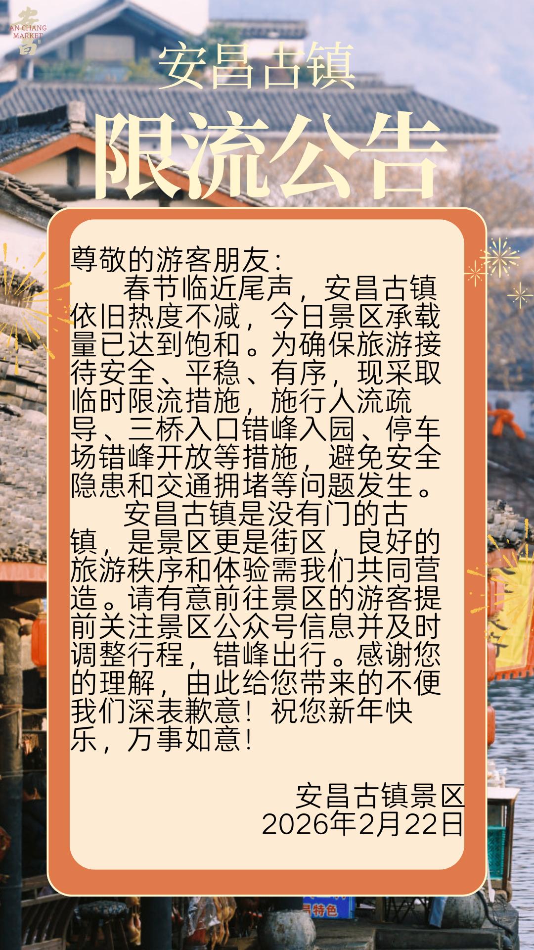 为此,安昌古镇景区还发布了《限流公告》,实行错峰入园,停车场错峰开放等措施。