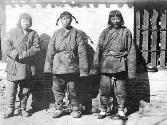 1900年前后,保定府监牢中,三名义和团拳民身戴沉重脚镣,身穿北方冬季厚棉衣裤,在砖墙与木栅栏前并排而立。 居中者双臂抱胸,神情肃穆;左侧者姿态相似,目光略显空茫;右侧者则直面镜头,嘴角挂着一丝苦涩的笑意。他们的姿态与神情各异——坚毅、茫然与苦涩交织,共同勾勒出被囚禁下的真实状态。