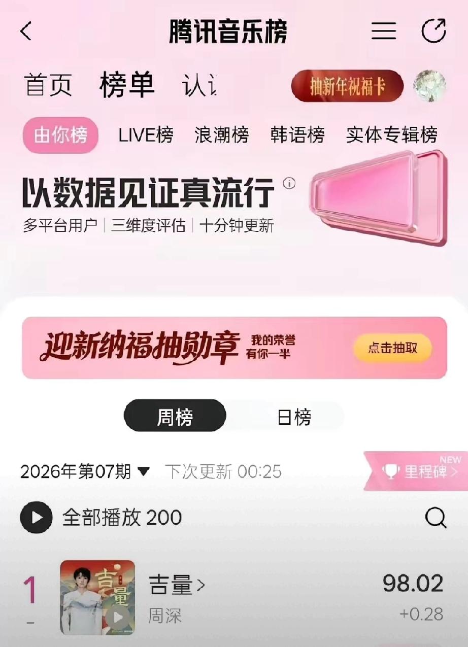 周深深夜冲上热搜!《吉量》霸榜刷屏,实力太惊人 2月22日凌晨,周深凭春晚歌曲《吉量》强势登顶腾讯音乐由你榜周榜TOP1,还连续5天拿下日榜冠军,与《接财运》包揽前二,直接霸屏热搜。 这首源自《山海经》的马年春晚曲目,一亮相就拿下歌舞类收视冠军。周深空灵嗓音搭配治愈合唱,将东方神话与童真温情唱进人心,传唱度爆表。 不靠炒作、不拼流量,周深长期霸榜、屡破纪录,用唱功与作品站稳国民歌手地位。从春晚舞台到音乐榜单全线开花,这就是实至名归!🔥 周深 周深新歌榜