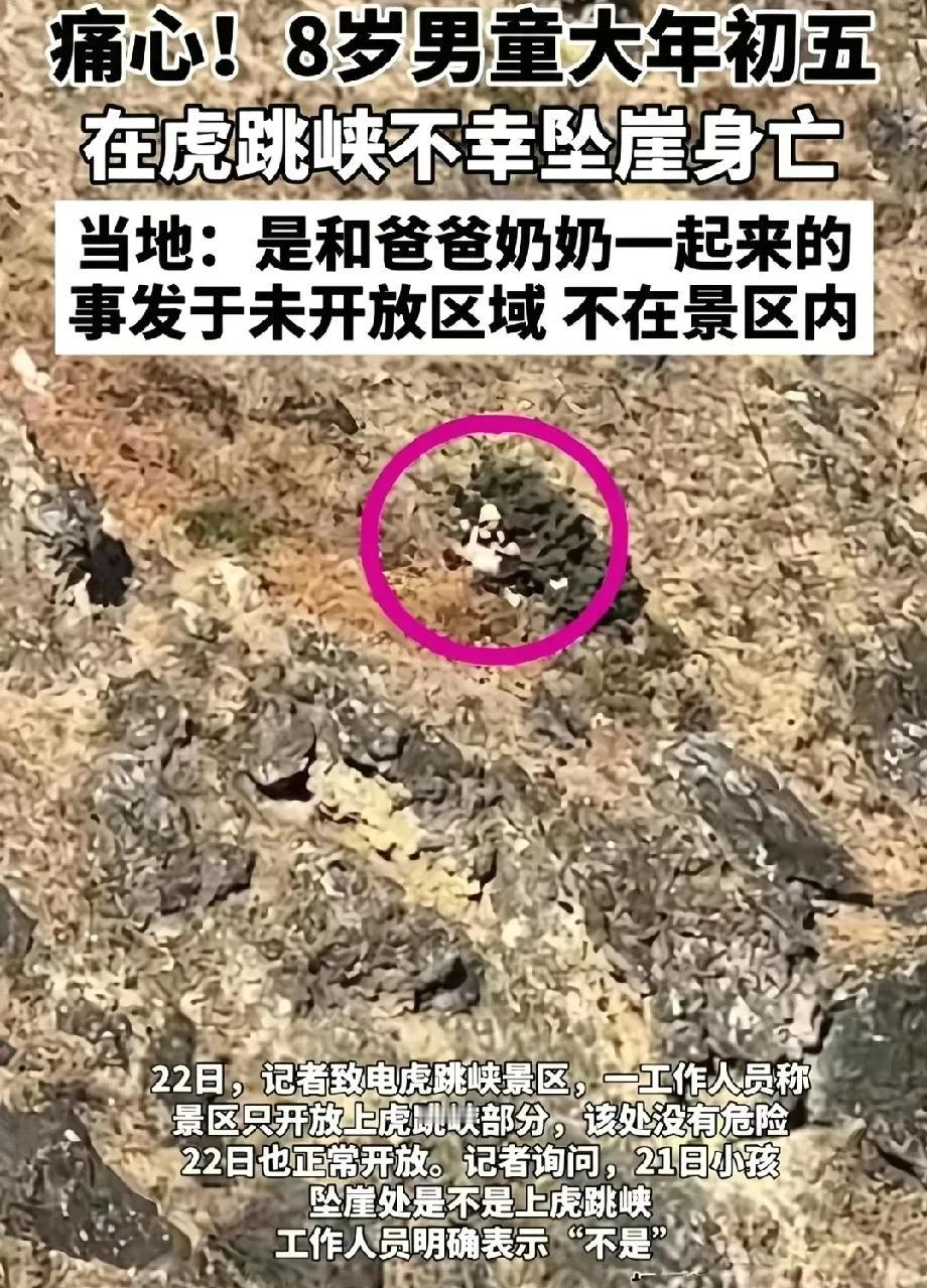 后怕啊,虎跳峡那孩子坠崖,仔细掰扯,他爹才是“真凶”。 同样是做爹的人,细想好几个点让我晚上没有睡好,越想越觉得后怕。 第一,孩子爹带去的那根本不是景区,是没开发的野路子,本地向导都慎走。 第二,当天山上风大得站不稳,有目击者说看着都心慌,这天气敢带八岁孩子上去,心太大了。 最要命的是第三,孩子从百米高摔下来后,内脏出血、多处骨折,这时候绝对不能乱动。可当爹的一把就给抱起来了 这在救援上是大忌,只会让伤情雪上加霜。 话说这孩子摊上这么个爹,真是一劫。 现在一想到有些父母光凭一腔“磨练孩子”的热血,就往危险地方冲,我就觉得脊背发凉。 作为家长,孩子的安全应该是放在第一位的,一味地给孩子人为制造危险环境,加以磨练,实在是不可取,出现这样的事情,最伤心悲痛是孩子家长,最应该反省的也是他们,如果不是极端的教育,孩子可能不会出事情,可惜...... 你们身边,有这种不顾安危的“冒险教育”吗?如果有的话,抓紧制止吧。