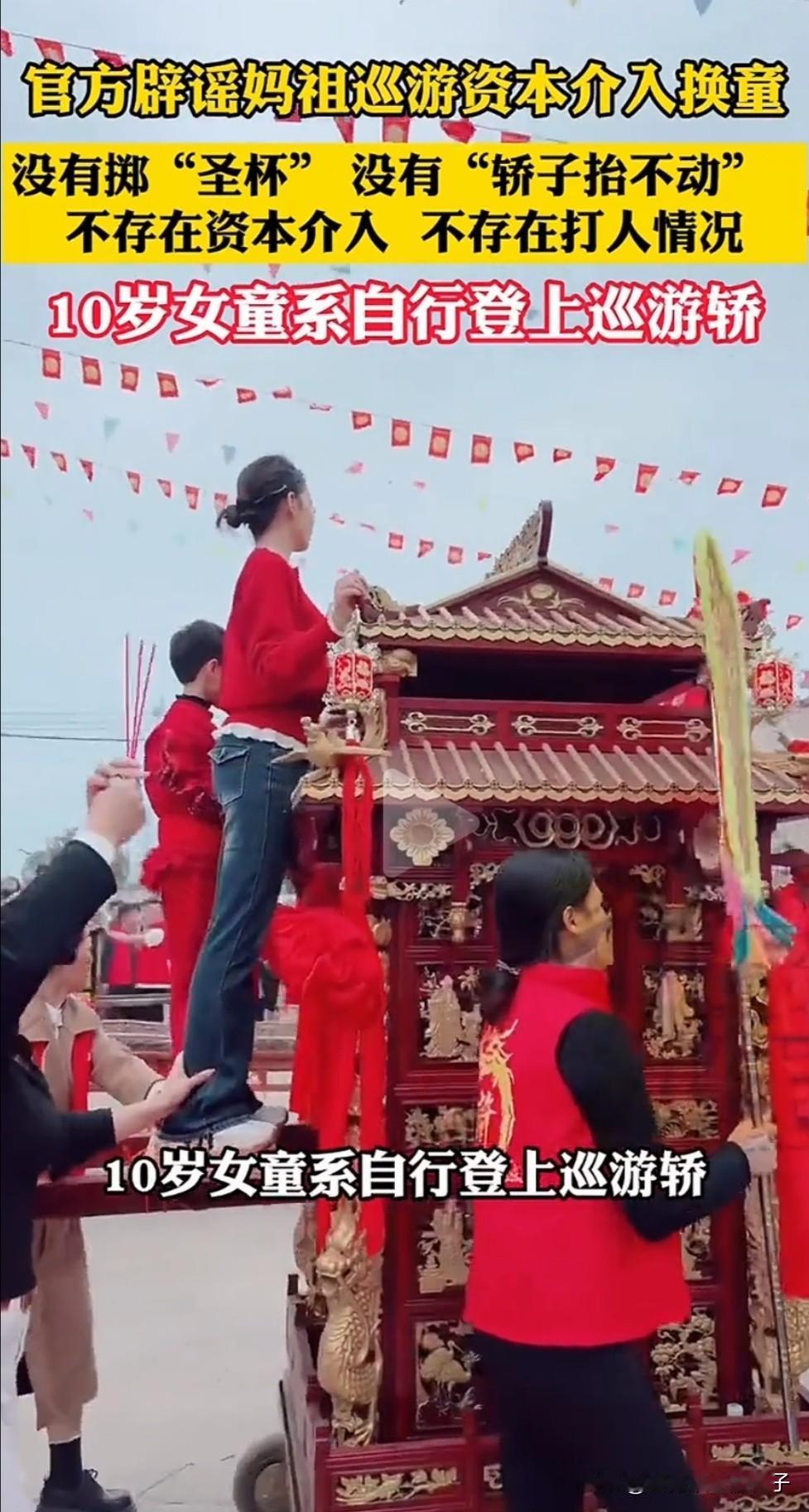 湛江妈祖巡游换神童官方通报! 其中有3点我理解不了, 第1、虽然不是当地人,也没参加过这类活动,但我想没有哪家父母,会在村里巡游时让自家孩子这样胡闹,随便爬神轿不管,这样肯定是不尊重妈祖的! 第2、现场活动视频,没看到有其它家小孩打扮成这样的,穿红色图喜庆能理解,但这衣服明显就是提前准备好的,并不像小孩临时起意。 第3、轿子离地的高度目测有1米,10岁女孩(官方通报是女孩,只是留的男生发型,表示怀疑)真的能自己爬上去吗?即使是孩子自己爬上去的,巡游队员也会把她拉下去吧。 大家怎么看呢?