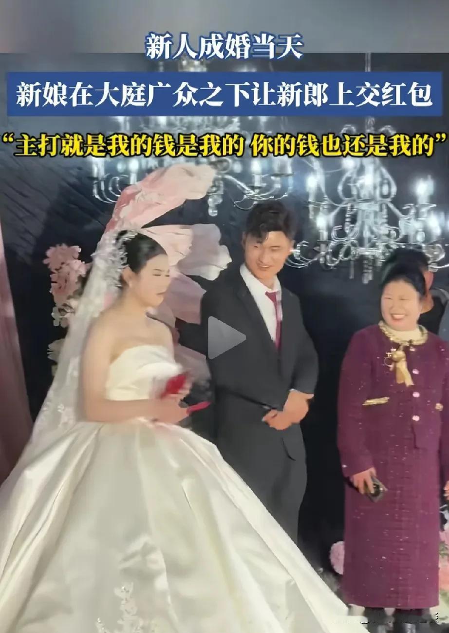 娶了一个这样强势的媳妇注定日后过不好。在婚礼上,新娘子伸手要收到的红包,新郎笑呵