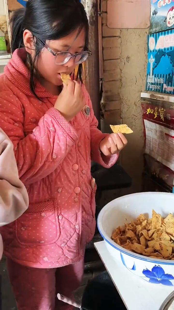 大家好,我是外来媳妇西北郎。离过年一天一天的又都近了,今天准备炸点麻叶子。为什么都要做这个东西?因为大家都知道兰花花是从河南远嫁到甘肃这边来的,每年到过年的时候都要做一些麻叶子。兰花花说是小的时候吃的零食,其实在西北过年的时候炸的是果果,虽然叫法不一样,但是做法基本上是大同小异着的。 今天就炸点麻叶子,大家不会做的也跟着学习一下。多炸一点,给干妈拿上一点。她说每年给她送的,她特别喜欢吃河南的麻叶子。看一下我们家三个女儿是在吃什么东西了?是因为今天有一些肥肉炸了一点油,她们吃油渣拌了一点辣椒,吃上去香不香?油渣大家小时候肯定也吃过,是不是特别香感觉?小时候的味道。 现在开始搓面,挖上五碗面。现在面已经搓好了,现在打鸡蛋,里面打上两个鸡蛋。现在开始放盐,底味加点盐就行了。麻叶子是少不了芝麻的,要不怎么叫麻叶子?撒些黑芝麻进去。这不愧是河南的女婿,现在做麻叶子也是一流的了。我给你打下手,是不是?是。可以了吧? 话说为了香,多撒点白芝麻,再撒点白芝麻。你和面快点,你和的好,你的手劲大。我的手劲大。是。那就好好好,这是作为河南的女婿必须要把这时候才学会。现在就一点一点的加水进去。西北狼你知道吧?麻叶子是我小的时候最喜欢吃的,每到过年我妈炸的都装到袋子里面,人想吃还不给人吃,怕吃完了。 这个塑料袋,现在就实现自由了,就是想吃就吃。现在人不缺东西了,以前人缺东西,因为来个人还要招待人给别人吃,所以我小的时候喜欢吃,都是偷着吃。 忘了放一样东西,最重要的河南的13香,老牌子的大品牌,给他们放上点,放点调和面,就是13香。现在面团已经要和的和的偏硬一点,偏硬一点把它和起来,放到边上就要把它醒一下。今儿活的可不少了,现在把它盖上盖上让它醒一会儿。 面醒一会儿的时候要二次把它再揉一下,让他们光着揉一下,面越醒越揉它就越光。现在就是面已经醒好了,拿出来把它封上几个剂子,分几个三个四个四个放上四个,分四个剂子。分好的剂子现在就是擀面,这个是最费劲的时候,去年的时候是用压面机做的,但是压面机做出来芝麻全部压烂了不好吃了。 今年的时候就是手工擀,全靠你掏劲了。我这是一天真的是咱们家的重劳力,现在看一下擀成一个大面张,有一有硬币那么厚,真的是个累人的活儿。我现在擀好了兰花花就是来切,切这个东西把它切好,有你擀面我都不用发愁了。现在就是开始切,就剩这么个能成吗?那样的不好看。 现在开始炸了,倒油,现在油热了就开始炸麻叶子,看一下黄灿灿的麻叶子炸好了,特别酥脆的,特别好吃。听一下这声音脆不脆?吃上你脆不脆?脆,好不好吃?好吃。看我们家这三个都在锅边上等着,像不像小时候我奶奶做饭的时候,我也是这样的,都是等着炸出来就赶快吃。大家看一下扎的这个,这个特别酥脆的。 今天炸了满满的一大盆子,因为准备是给朋友给一点,还有我干妈给一点,我们拿得出手的也就只有这些东西是我们自己做的,我们一点儿心意。我给大家吃一个,大家看一下脆不脆,这个掉渣,芝麻味儿特别浓郁,特别好吃。过年了,在家给自己动手做起来。这是一个小零食,好吃的麻叶子,离得近的朋友可以到我们家来吃。 我们媳妇儿做的这个东西就是河南叫麻叶子的里面做的芝麻的,你看到的这个口口宽的很,你拿回去你们吃去。不用谢,都尝一下,你尝一下看好吃这么,刚刚做完。 好了今天的视频,麻叶子就炸到这了,给大家再见,再见。