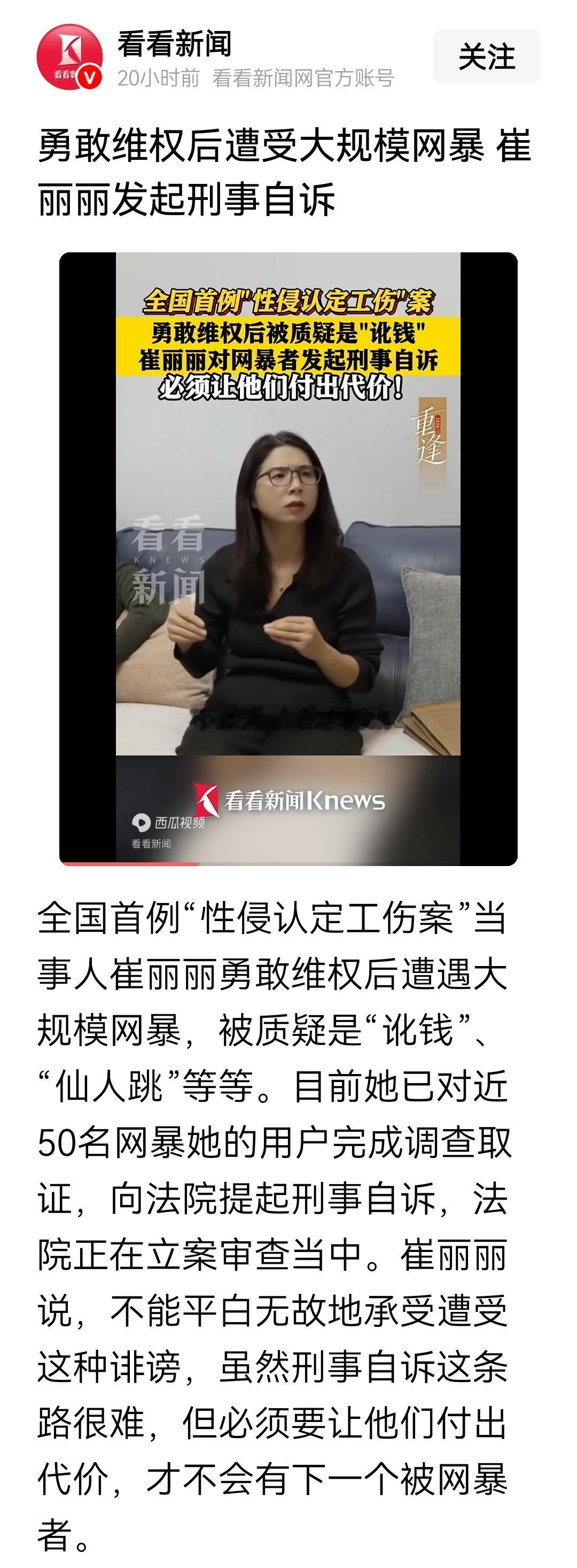 媒体报道,勇敢维权后遭受大规模网暴, 崔丽丽发起刑事自诉。其实,评论与侮辱诽谤是