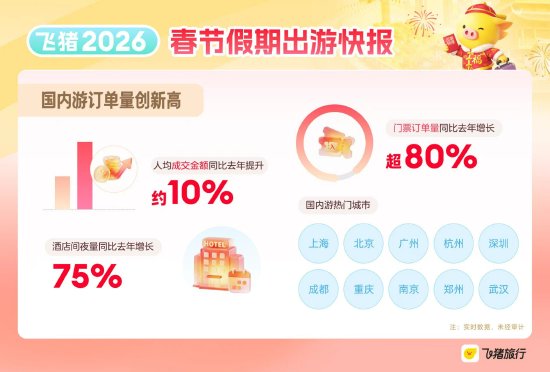 出游频次更高、游玩内容更丰富,人均旅游消费持续提升。飞猪数据显示,春节假期国内游人均预订金额较去年提升约10%,其中高星级酒店人均预订间夜量接近3晚;包含住宿和玩乐权益的热门乐园及景点套餐商品订单量同比增长140%。88VIP用户旅游消费热情尤为高涨,带来的酒店间夜量、门票订单量全部翻倍增长。