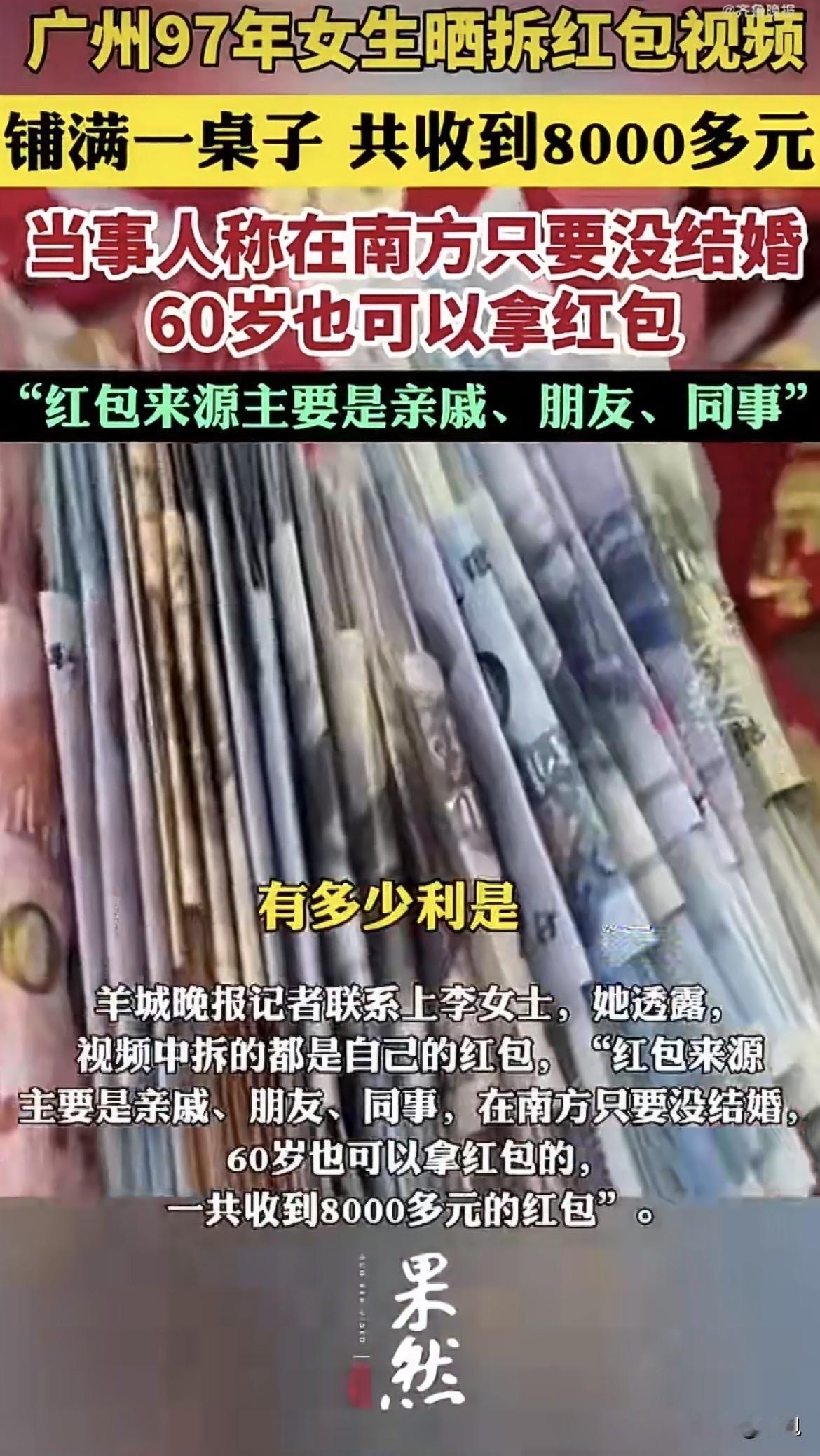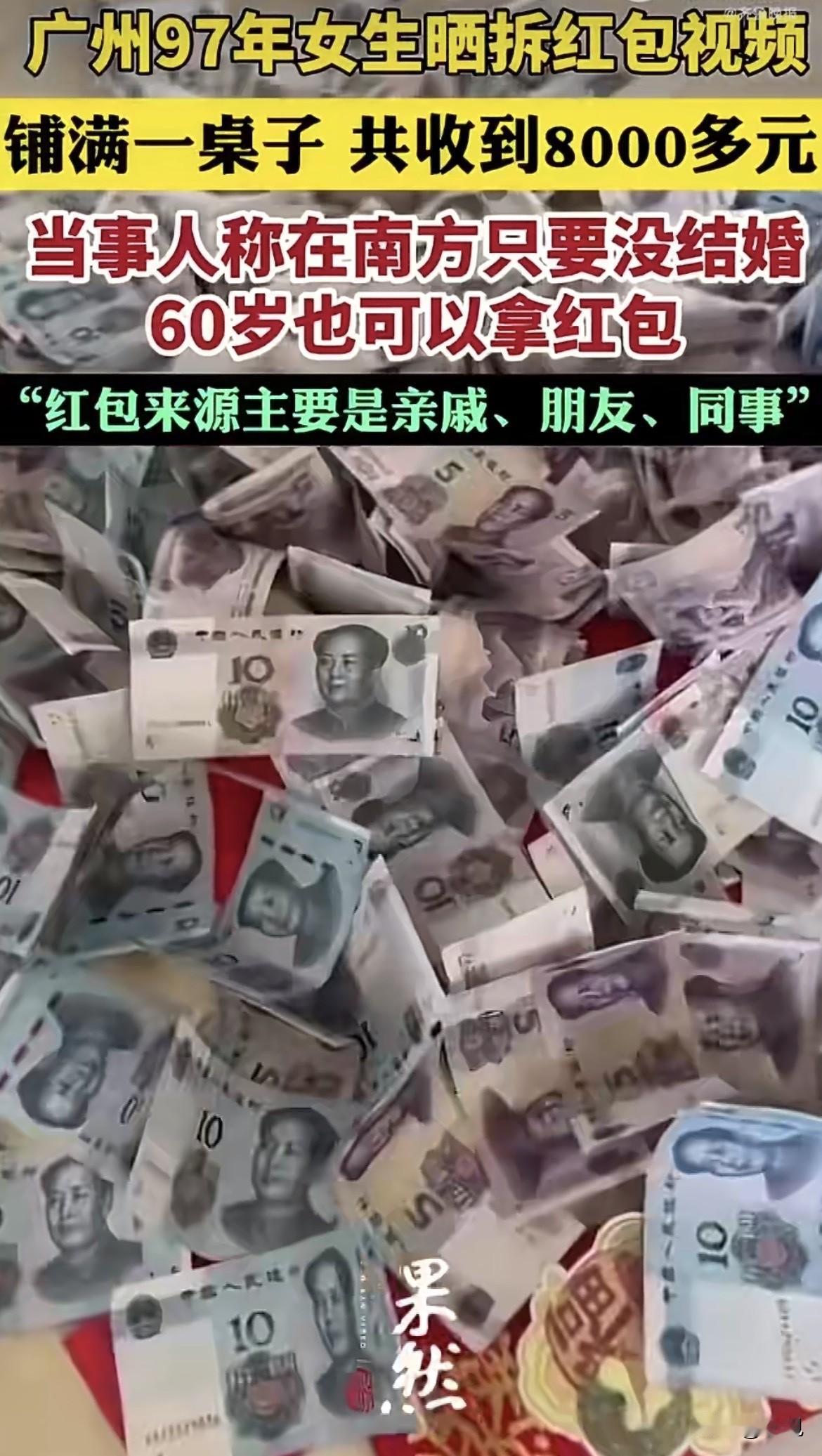 这是什么神仙操作 广州一个29岁的姑娘,过年把红包铺了满满一桌子。 红彤彤的一片,看着是真壮观。 姑娘自己都惊了,拍了视频发网上,说就是普通广州家庭收到的红包。 有网友在底下留言,红包小不要紧,数量赢了。 姑娘回了一句,最紧要有气势。 据潇湘晨报报道,记者找上门去问,姑娘挺实在,说这些都是她一个人的红包。 亲戚给的,朋友给的,同事给的,加一起有八千多块。 她说在南方这边,只要没结婚,60岁了也能拿红包。 这句话直接让评论区炸了锅。 没结婚就能一直收红包? 60岁的大爷大妈还能伸手要红包? 广东网友出来解释,这是真的。 在广东,发不发红包不看年龄,看婚否。 结婚了就是大人了,就得往外掏钱。 没结婚,哪怕四十岁五十岁,在长辈眼里还是孩子。 有个网友说我表姐45岁没结婚,每年跟着我们走亲戚,我们发钱她收钱。 还有个网友说,在广东结婚是要付出代价的,不仅没了收红包的资格,还得准备好一沓五块十块见人就发。 很多人好奇,不是说广东红包都只有五块十块吗。 八千多块是怎么凑出来的。 据羊城晚报等媒体报道,今年春节一张"广东利是金额参考图"在朋友圈刷屏——血亲100元、旁亲50元、老表20元、亲戚10元、邻居5元、拜神2元。 这张图是广东网友自发整理的民间参考口径。 有人算了笔账。 姑娘97年的,今年29岁,未婚。 父母爷爷奶奶外公外婆,这些至亲一般给一百到两百。 叔伯姑姨这些旁系血亲,五十到一百。 结了婚的堂表兄弟姐妹,二十到五十。 同事朋友结了婚的,五块二十。 再加上邻居给的,小区里认识的叔叔阿姨给的。 如果亲戚多社交广,收上百个红包很正常。 平均一个按七八十算,一百个就是七八千。 而且广东人虽然讲究小额利是,但对自家孩子,给个几百也是常事。 有网友说,以前没结婚的时候每年也能收五六千。 姑娘自己说了,最要紧的是有气势。 这话挺有意思。 比金额有什么意思。 比数量比气势,这才是广东人的格局。 有人问八千多块算多吗。 评论区吵起来了。 有人说广东人你们骗我,不是说好了五块十块吗。 有人说这是少数,大多数广东人还是五块十块为主,五十就算豪华包了。 有人说我妈每年准备两千块,能发两百个红包,平均一个十块。 有人说八千块那种,得是亲戚特别多的大家族。 据网易文创《中国压岁钱调查报告》数据显示,广东0-50元区间的占比远高于其他省份,在当地民俗语境中,50元便堪称"豪华大包"。 争论金额多少其实没意思。 有意思的是姑娘那句60岁也能拿红包。 这话戳中了很多人的心。 外省网友羡慕哭了。 什么,60岁还能收红包。 我现在嫁去广东还来得及吗。 建议全国推广未婚一直收的规矩。 我三十岁未婚,在老家已经没人给我发了,还要给侄子外甥发,亏大了。 广东人太会了,这才是红包该有的样子,收的人开心,发的人没压力。 广东利是的核心,从来不是金额多少。 据羊城晚报报道,它由古代的压祟钱演变而来。 取的是利事利市的吉祥谐音。 承载的是破除霉运诸事顺遂的好意头。 它派发的范围越广,说明这个人的人缘越好祝福越多。 它金额越小,说明派的人越轻松收的人越没负担。 这才是真正的年味。 不同于其他地区红包侧重人情往来的属性,广东利是更承担着社会联结功能,在家庭、职场、社区等场景派发,织就温情的社会网络。 早在2025年1月,汕头市文明办就指导举办了"广东小额红包·讲心不讲金——拒绝攀比压岁钱,移风易俗过大年"主题宣传活动。 红纸一张,利利是是。 送给你的是一张红纸。 但里面的祝福,千金不换。 那个广州姑娘晒出的八千多块。 真正让人羡慕的不是钱。 而是她背后那个庞大的社会网络。 有那么多亲戚朋友愿意给她送祝福。 这才是真正的富有。 你们那边发红包有什么规矩。 今年收了多少发了多少。 来评论区聊聊。