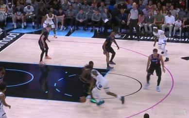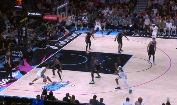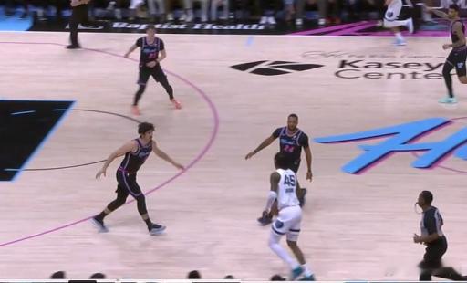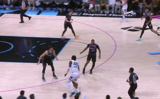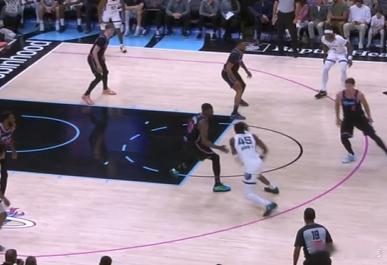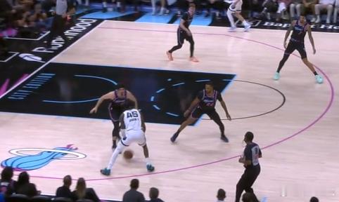 13 14 15 16 17 18小皮蓬强侧持球发动边路挡拆,行进间吸引弱侧哈克斯回收协防后立即找到左翼的GG杰克逊,GG接球的同时使用横撤步+一二步急停调整好脚步后,立即顶着前来扑防的哈克斯拔起出手三分,空心入网。