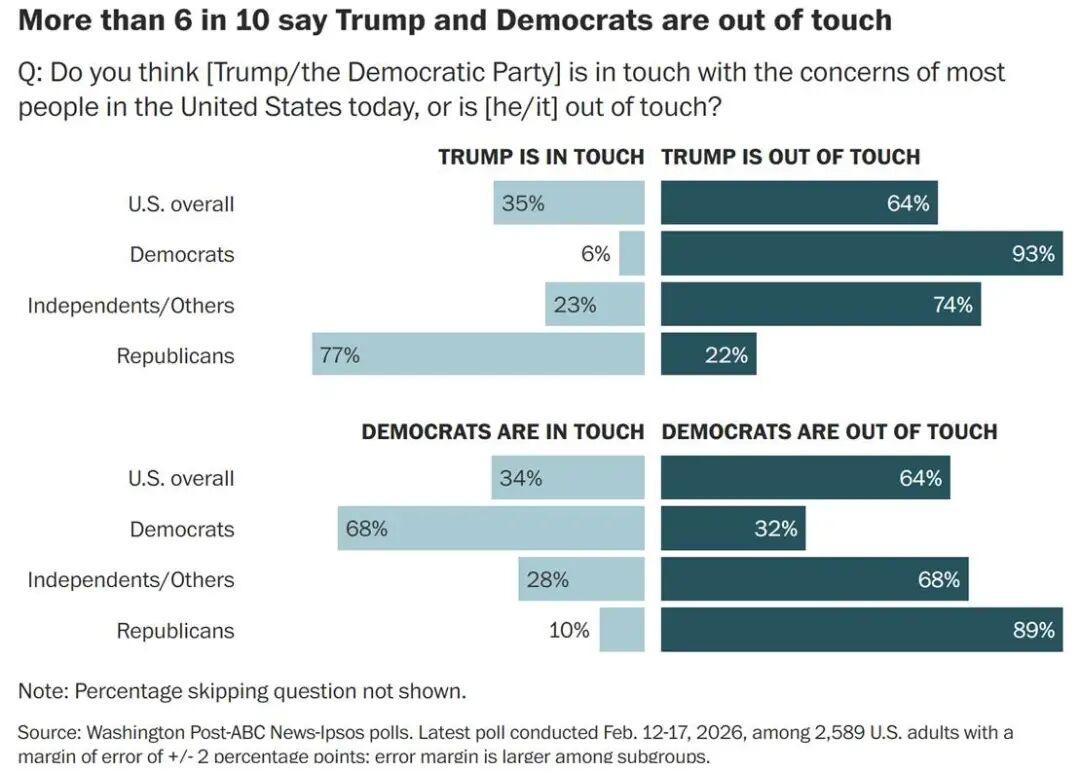 不过,民众对特朗普的不满,尚未转化为对民主党的热情支持。事实上,当被问及更信任谁