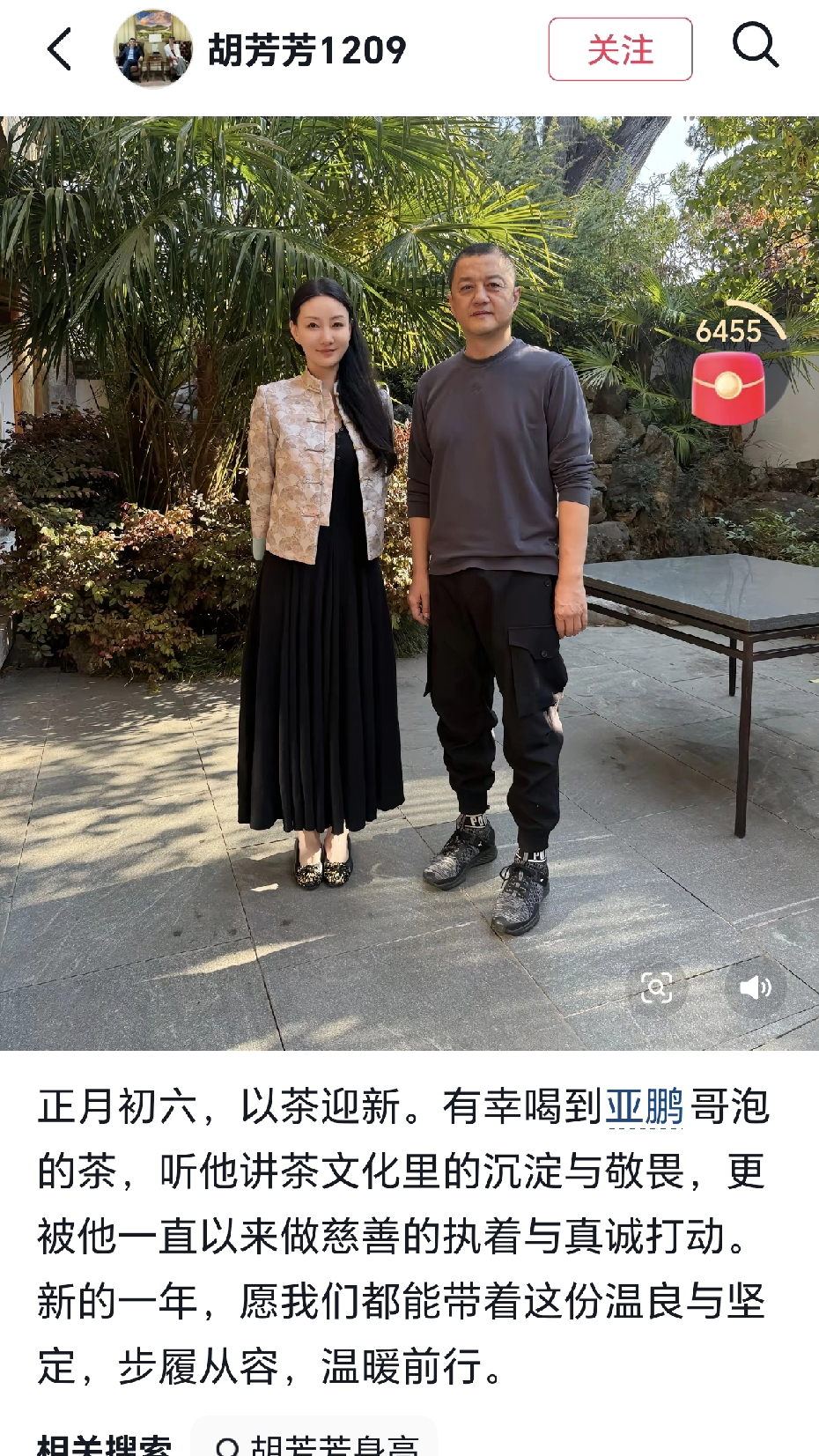 李亚鹏穿着一双白灰鞋子,一身行头与初六在陈光标作客一样。胡芳芳配文:正月初六,以茶迎新。有幸喝到亚鹏哥泡的茶,听他讲茶文化里的沉淀与敬畏,更被他一直以来做慈善的执着和真诚所打动。新的一年,愿我们都能带着这份温良与坚定,步履从容,温暖前行。