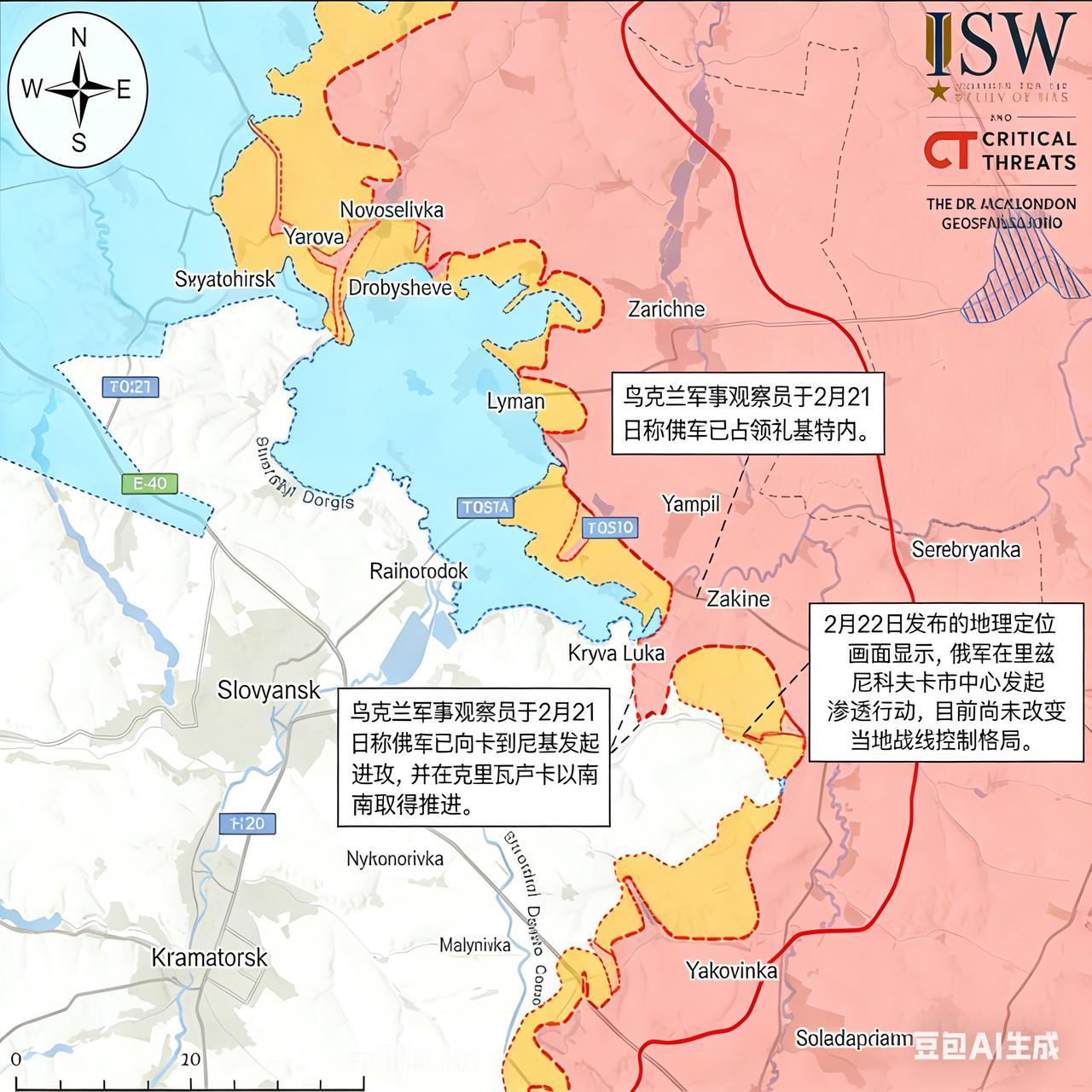 决战双子城之外围争夺:俄军打开斯洛维扬斯克外围突破口 乌克兰军事观察员马绍维茨2月21日证实,俄军已攻占斯洛维扬斯克东北的扎基特内,并在克里瓦卢卡以南取得推进,同时向斯洛维扬斯克以东的卡列尼基发起进攻。据战争研究所结合战场信息研判,俄军已大概率推进至卡列尼基北部区域,打开斯洛维扬斯克东侧外围突破口。 2月22日发布的地理定位画面显示,俄军在斯洛维扬斯克以东的里兹尼科夫卡市中心实施渗透行动,乌军对俄军占据的建筑实施精准打击。此次渗透未改变战线控制权与前沿接触线,但反映出俄军正以小股渗透配合正面进攻,持续试探乌军防御薄弱点。 2月21日至22日,俄军在斯洛维扬斯克周边展开全域攻势:北线进攻圣山附近,东北线针对扎基特内、德罗尼夫卡,东线聚焦里兹尼科夫卡,东南线向尼基福罗夫卡、费多里夫卡德鲁加推进,形成多点施压、重点突破的进攻格局。 马绍维茨披露,俄军第20诸兵种合成集团军(莫斯科军区)主力向红利曼西北的亚罗瓦、普雷希布、新谢利夫卡及德罗比舍夫突击,意图切断红利曼西北方向通道;同时向圣山方向推进,控制索斯诺韦(红利曼西北)与亚历山德里夫卡(博罗瓦以南),为从北线合围斯洛维扬斯克铺路。 当前俄军主攻区域被压缩在北顿涅茨河与E40(M03)斯洛维扬斯克—巴赫穆特公路之间,便于兵力火力集中投放,进攻效率显著提升。 乌联合部队发言人特列胡博夫2月22日证实,俄军试图经德罗比舍夫、斯塔夫基绕过红利曼,最终夺取斯洛维扬斯克东北的赖霍罗多克,直接威胁斯洛维扬斯克侧翼,但该方向未取得实质性突破。乌军旅级发言人补充,俄军加大对扎基特内的渗透力度,但在斯洛维扬斯克以东的普拉托尼夫卡渗透行动失败;此前2月20日,俄军零星突击小组曾突入红利曼郊区。 战场环境对俄军行动形成制约:俄西部集群关联军事博主2月22日称,气温回升导致热列别茨河泛滥, 影响到俄军在扬皮尔、扎里奇内(红利曼以东)及红利曼周边的后勤运输。 马绍维茨强调,俄军若想攻占斯洛维扬斯克、克拉马托尔斯克,所需兵力与物资将远超此前攻占波克罗夫斯克、米尔诺格勒的规模,当前兵力投入尚不足以完成决定性攻坚。 在康斯坦丁诺夫卡方向,俄军事博主2月22日直言,俄军在托尔斯科耶的推进报道“过早且夸大”。 (本文部分参考战争研究所报告)