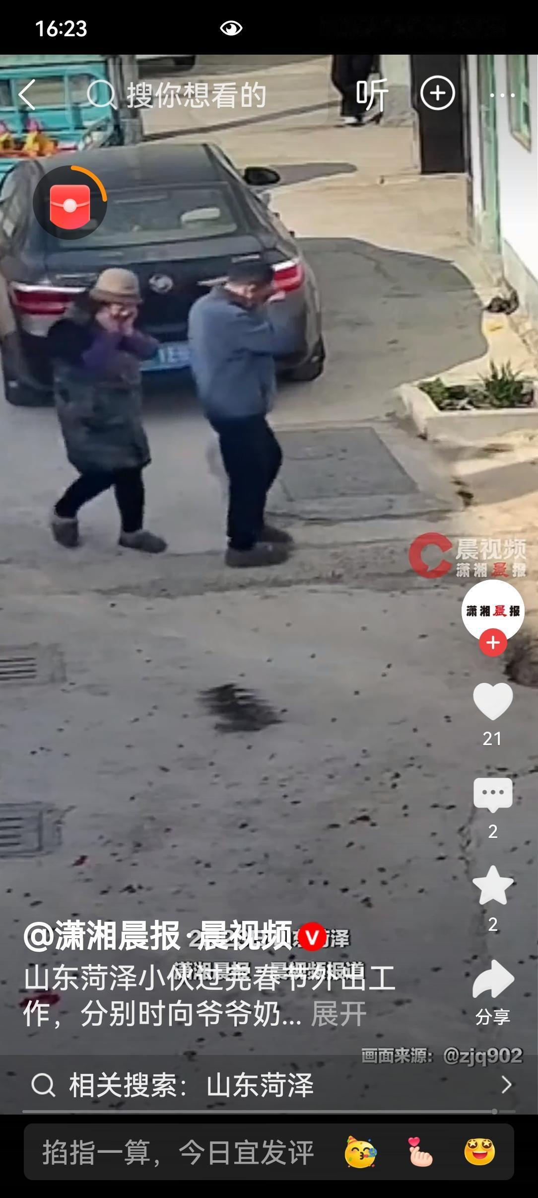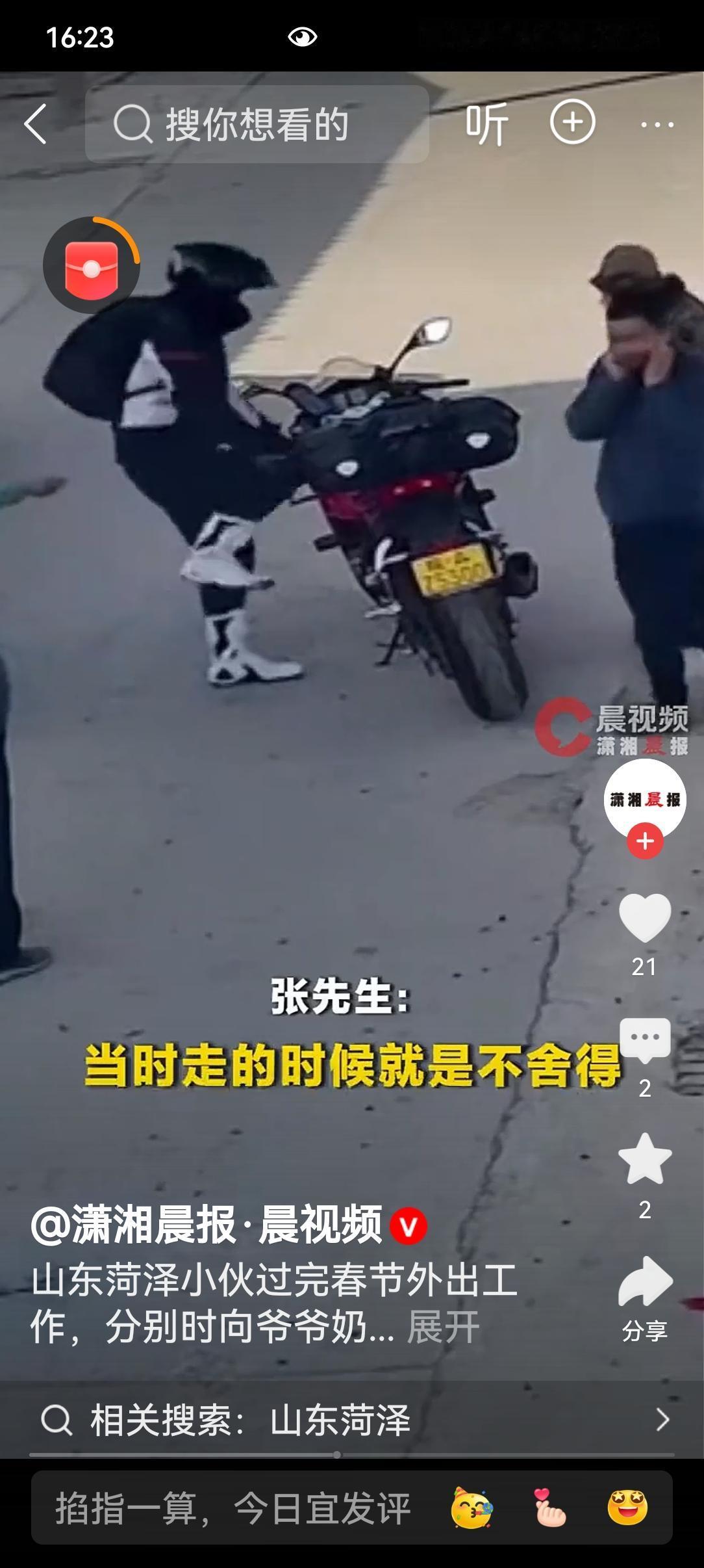 最高的敬意!山东小伙春节返岗,临别一跪藏着最深的牵挂 春节的团圆总是短暂,离乡的背影最是戳心。 山东菏泽一位小伙返岗时,给爷爷奶奶磕头告别的视频,近日刷爆网络。 这一跪,没有华丽的言语,却道尽了游子对亲情的不舍,也藏着刻在山东人骨子里的孝顺与教养。 近日,在山东菏泽的乡村街头,即将前往合肥工作的张先生,在临上车前停下了脚步。监控画面里,他走向站在路边的爷爷奶奶,二话不说便跪了下去,郑重地磕了头。 这一跪,是感恩,是不舍,更是牵挂。 张先生说,爷爷奶奶都已经七十多岁了,自己一年也回不来几次,这一磕,是想让老人放心,也是想表达自己心里的惦记。 头盔遮住了他的脸庞,却挡不住滑落的泪水。 他坦言,磕头的时候强忍着没哭,直到车子开出村头,才敢偷偷擦去眼泪。 而镜头的另一端,两位老人站在原地,望着孙子离去的方向,久久不愿转身。 这不是什么刻意的表演,而是最朴素的中国式离别。 在鲁南大地,磕头从来不是封建糟粕,而是晚辈对长辈最高的敬意。 无论是春节拜年,还是远行告别,这简单的仪式,把藏在心里的爱与感恩,用最郑重的方式表达了出来。 我们总说年味变淡了,但在这些乡土的角落里,在这些刻在骨子里的习俗里,亲情从未缺席。 每一个背井离乡的打工人,心中都有这样一份牵挂:身后是渐渐老去的父母,身前是不得不奔赴的远方。 “父母在,人生尚有来处;父母去,人生只剩归途。” 这一跪,跪的是岁月,念的是亲情。 你的家乡,离别时会有这样郑重的仪式吗?你又曾为了哪次离别偷偷掉过泪?欢迎在评论区分享你的故事。 (内容取材网络)