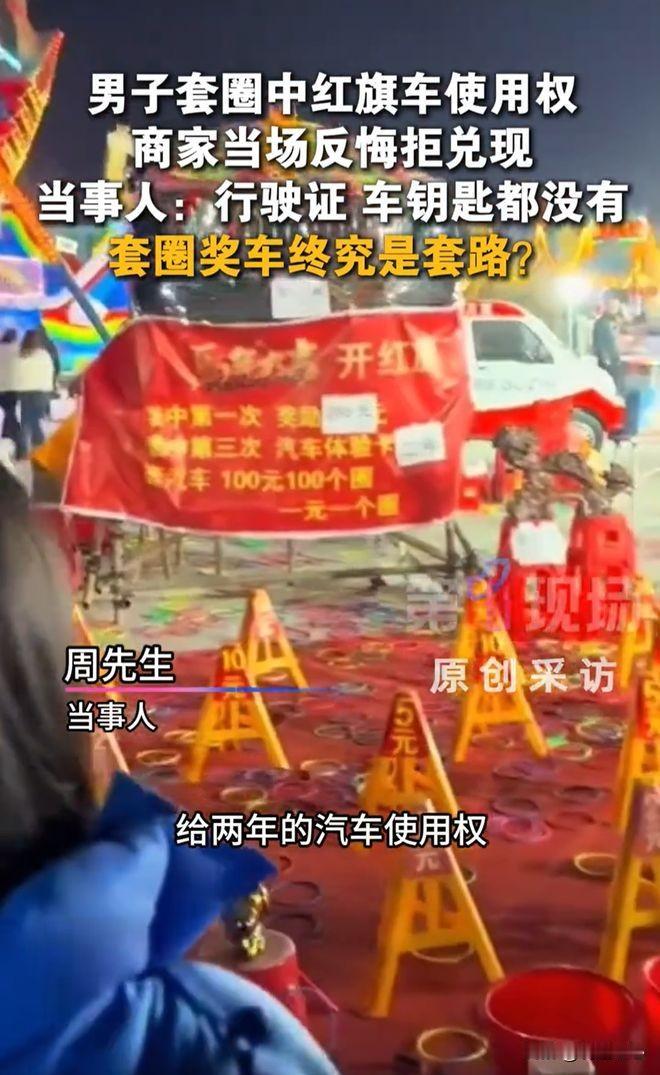 这不是玩不起吗? 2月22日,正值大年初六,山东曲阜这个圣人之乡,竟然在热闹的庙会上演了一场闹剧。男子周先生凭本事在套圈摊位套中了一辆红旗轿车,本以为是开年大吉,结果老板当场表演了一个瞬间失忆,耍起赖来连脸都不要了! 视频显示, 整个摊位被围得水泄不通,不同于常见的毛绒玩具,这里的三脚架上贴着亮眼的现金面值,而最顶端的神坛上,赫然摆着一辆红旗轿车的承诺。 规则写得清清楚楚:套中一次奖288元,套中三次,送两年汽车使用权。周先生也是个豪爽性子,当场砸下5600元买了五千多个圈。只见他站在划线外,眼神专注,手起圈落,在那密密麻麻的投掷中,那个决定命运的三脚架竟然接连三次被他稳稳套中! 可这时候,刚才还笑得跟朵花儿似的摊主,那脸拉得比驴还长。 面对两年的车辆使用权,摊主开始大耍无赖:先说车不是自己的,再说车主在国外,甚至连没钥匙、没行驶证这种蹩脚的理由都搬了出来,翻来覆去就一句话——车,你开不走;钱,我也一分不退。那种“我摆出来就是让你看,不是让你拿”的傲慢,简直令人发指。 直至警方介入,老板才心虚地吐出了那5600元本金,而那辆红旗车,还是没能开走。 其实,这种豪车套圈的戏码并非首创。 去年2月,山东滨州的王先生为了套中一辆玛莎拉蒂,甚至驱车几百公里跨省赶到河南商丘,砸下2000元,扔了近8000个圈,手臂都甩肿了才套中。 这剧情更是跌宕起伏:摊主先是说“那是段子,没套中”,后来见舆论压不住了才改口承认。最终,在当地部门的介入下,王先生硬是凭着一股韧劲儿拿到了钥匙。 两件事比较来看,折射出的是同样的江湖套路: 商家用豪车做诱饵,赌的就是没人能套中。一旦遇到周先生这种硬骨头,他们就想用退还本金来息事宁人。 老话说:“君子爱财,取之有道。” 摊主摆出奖品就是一种邀约,周先生套中即构成承诺,双方的合同已经成立。根据《民法典》第五百七十七条,当事人一方不履行合同义务的,应当承担采取补救措施或者赔偿损失等违约责任。这种只许赢不许输的行为,不仅违背了诚实信用原则,更可能涉嫌欺诈。 周先生最后选择了退款了事,虽说是大度,但某种程度上也纵容了此类投机取巧的行为。 摊主既然敢拿红旗车当下注,就得有输掉车钥匙的觉悟! 如果你是周先生,你会接受“只退本金”的方案吗?
