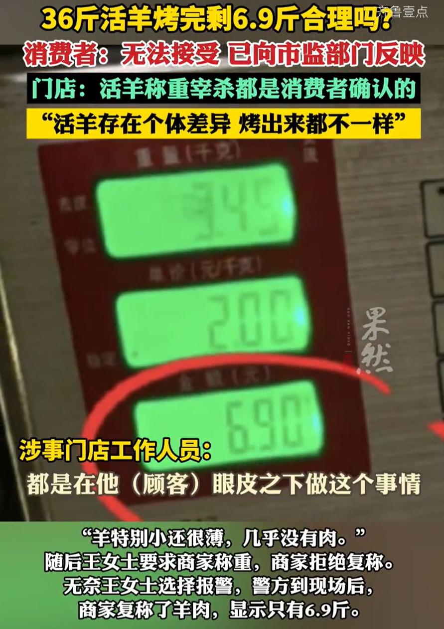 “这就太过分了!”重庆,女子一家人除夕夜没有在家做饭,而是到饭店花1188元点了一个烤全羊套餐,没成想,36斤的活羊烤完后就剩下6.9斤,女子当场报警,可店家却说:这是正常的! 王女士介绍,除夕夜当天一家人图省事,专门跑到当地一家烤全羊的店,花1188块钱买了个烤全羊套餐 到店后,店家也实在,拉来一只活羊,当场称重,36斤,看着挺壮实的一只,王女士一家挺满意,就等着晚上这顿大餐了 可等到烤全羊端上桌,王女士越看越不对劲。盘子里的羊,个头小了一大圈,肉质干瘪,骨头都支棱着,根本没多少肉 王女士心里犯嘀咕,这跟刚才那只活羊也对不上号啊。她当场提出,能不能把这只烤好的羊再称一下,看看到底有多重 但店家的反应很直接,先是拒绝,说烤全羊脱水,重量本来就会少,烤完就剩四成,这都是正常损耗,没必要称。王女士不干,两边争执不下,最后王女士只能报警 警察到了现场,店家的态度才变了,同意复称。结果上秤一称,这只烤好的羊,只有6.9斤 从36斤活羊,到6.9斤熟肉,这中间差了将近30斤。王女士气坏了,这不就是坑人吗? 但店家还是有说法的。他们说,活羊宰杀要去掉皮、内脏、头、蹄子,这些一除,就剩四成左右,也就是14.4斤。然后烤的时候,羊的个体有差异,这只羊烤得比较干,水分流失得多,所以最后就剩这么多了。而且还强调,当时活羊是让王女士确认过的,羊腿上也做了记号,不可能换 听起来似乎每一步都能解释,但问题就出在这个所谓的正常上 36斤活羊,最后只剩6.9斤熟肉,这个损耗率接近81%。这是什么概念?就算是宰杀去掉下水,再去掉骨头,一只羊的出肉率也不至于低成这样。按正常情况,活羊宰杀后,去掉皮毛内脏,能剩下个17到20斤左右。再烤熟,去掉水分,正常也得有12到14斤肉。王女士这个6.9斤,连正常量的一半都不到 那剩下的肉去哪了?这恐怕不只是烤干了这么简单。要么是称活羊的时候做了手脚,36斤水分太大,实际宰杀后根本没那么多肉 要么是烤的过程里,肉被人为剔掉了一部分,或者是羊被调了包。还有一种可能,就是所谓的活羊称重就是个幌子,最后端上桌的根本不是称的那只 店家的解释,说来说去都是在说损耗,但唯独没说清楚,为什么损耗会多出这么一大截。烤得干,能差出五六斤肉吗?这显然说不过去 王女士现在把这事投诉到了市场监管部门,正在等结果。这家店到底有没有问题,最后还得看官方调查 其实类似的事,这几年没少发生。烤全羊、海鲜加工,这些按活物称重再加工的东西,最容易出猫腻。因为中间环节多,消费者很难全程盯着。从活到熟,这中间有多少损耗,全凭店家一张嘴 但损耗归损耗,不能把消费者的信任也一起损耗掉。一只36斤的羊,烤完只剩6.9斤,这已经不是什么行业惯例的问题了,这是在拿消费者当外行糊弄 吃一堑长一智,以后遇到这种活物称重的,最好从活到熟全程盯着,或者直接按熟食称重结账,省得最后扯皮。至于这家店,是不是真把顾客当成了冤大头,等着看市场监管的结果就行了 36斤活羊烤完剩6.9斤 商家称正常