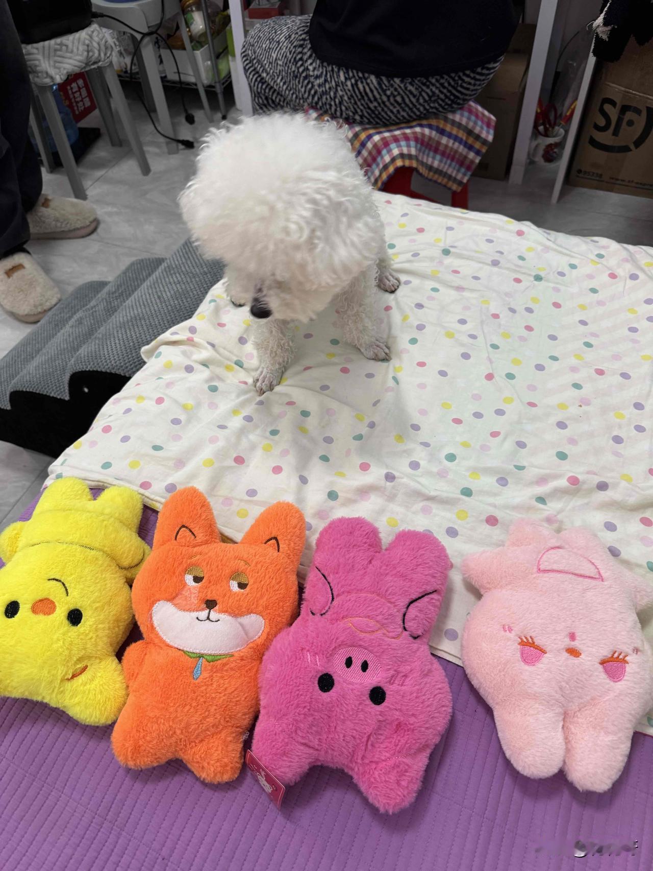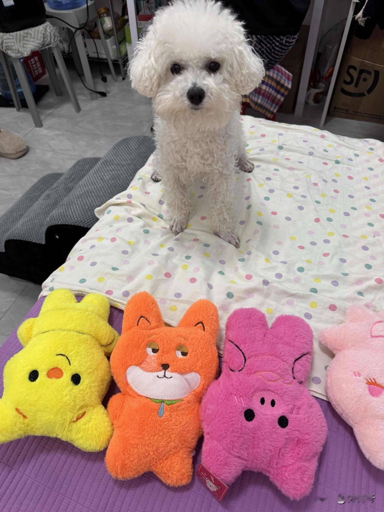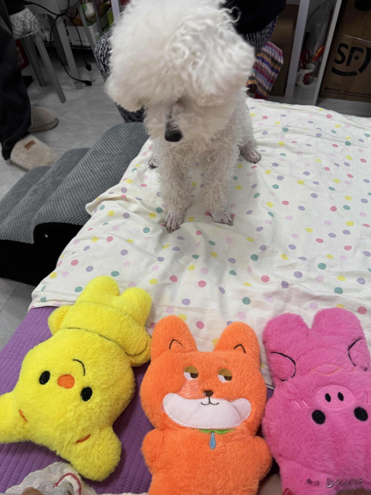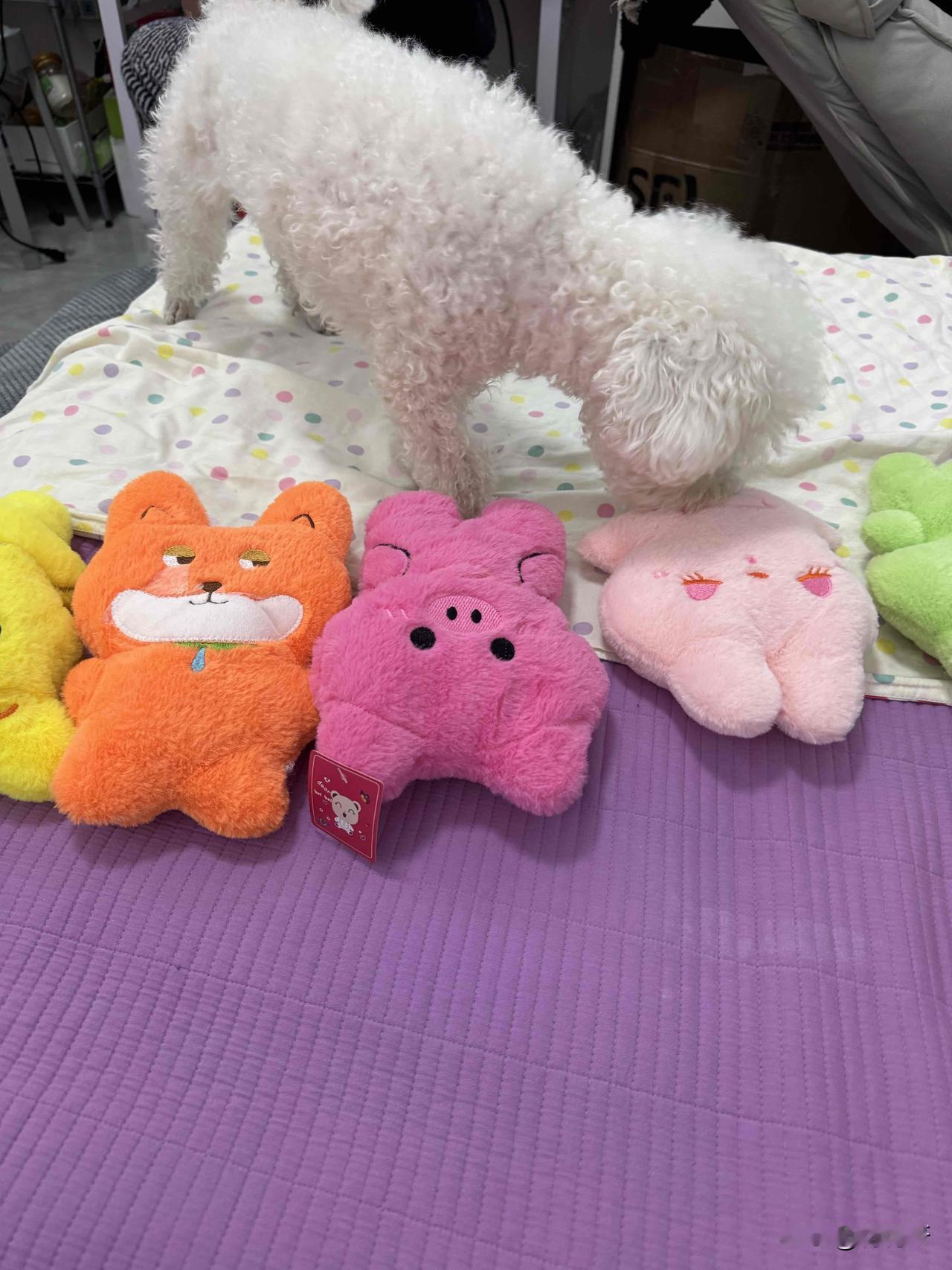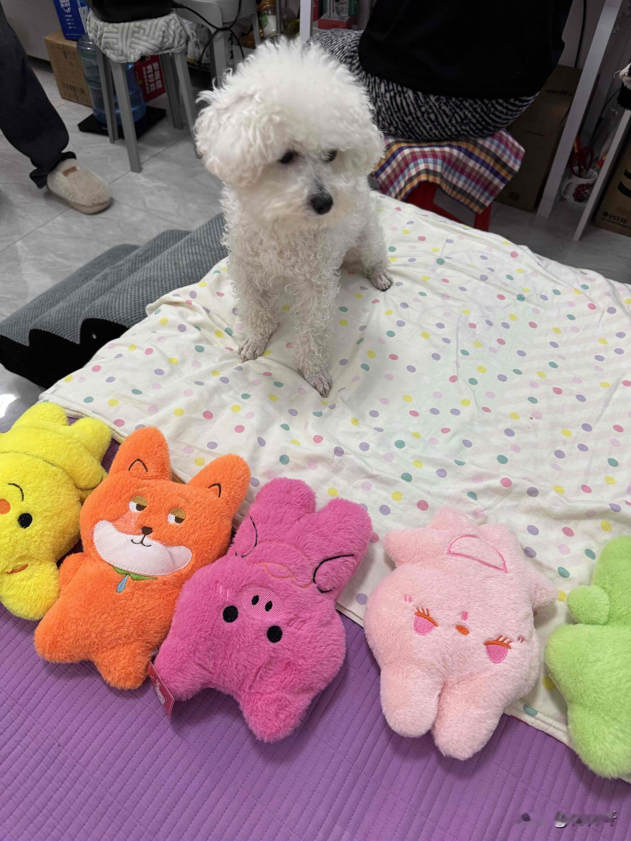 喜欢娃娃的小比熊眼花缭乱了,这些漂亮的娃娃选哪一只才好呢,昨天去逛商场,因为不能带狗,小比熊在家呆着了,在商场一楼夹趣娃娃机,幸运的夹到了五个娃娃,回来让小比熊挑,挑到哪个娃娃就给哪个,看看它这呆萌的样子,不知道选哪个好了,好像都喜欢,这可怎么办才好难为它了[笑哭]小比熊围着那五个娃娃转了一圈又一圈,时不时用小鼻子嗅嗅这个,用爪子扒拉扒拉那个。它那圆溜溜的眼睛里满是纠结,时而看向憨态可掬的熊猫娃娃,时而又瞅瞅可爱粉嫩的兔子娃娃。 突然,它咬住一只粉色猫咪娃娃的一角,使劲往自己的小窝里拉。可没拉两步,又停下了,眼睛看向旁边的蓝色恐龙娃娃,似乎有些犹豫要不要换一个。它松开猫咪娃娃,跑去嗅了嗅恐龙娃娃,喉咙里还发出了“呜呜”的声音,好像在和娃娃交流。 就在大家以为它选好了恐龙娃娃时,它又转身奔向了那个穿着公主裙的小熊娃娃,用脑袋蹭了蹭它,尾巴摇得像拨浪鼓。这小模样,真是让人又好笑又心疼,不知道它最后到底能不能下定决心挑出一个最爱的娃娃呢😆。