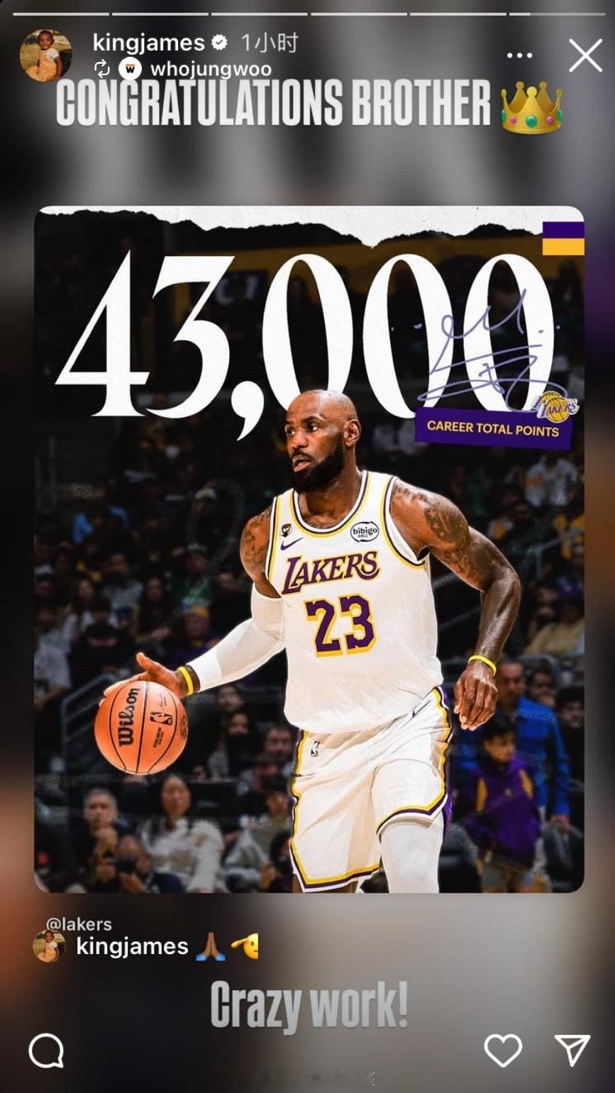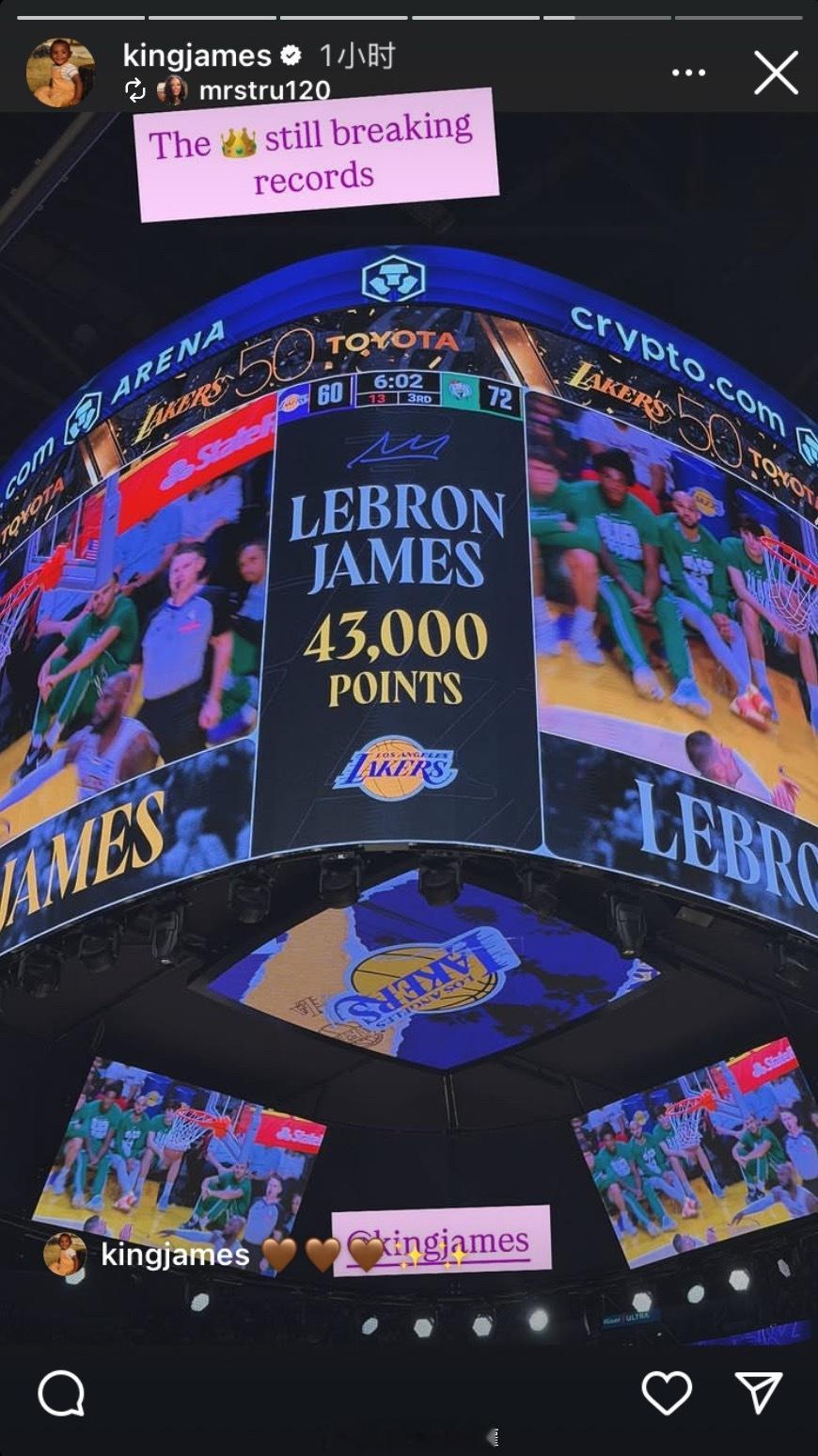 😏高兴得睡不着觉!詹姆斯连发5条IG限动,庆祝自己达成43000分里程碑!
