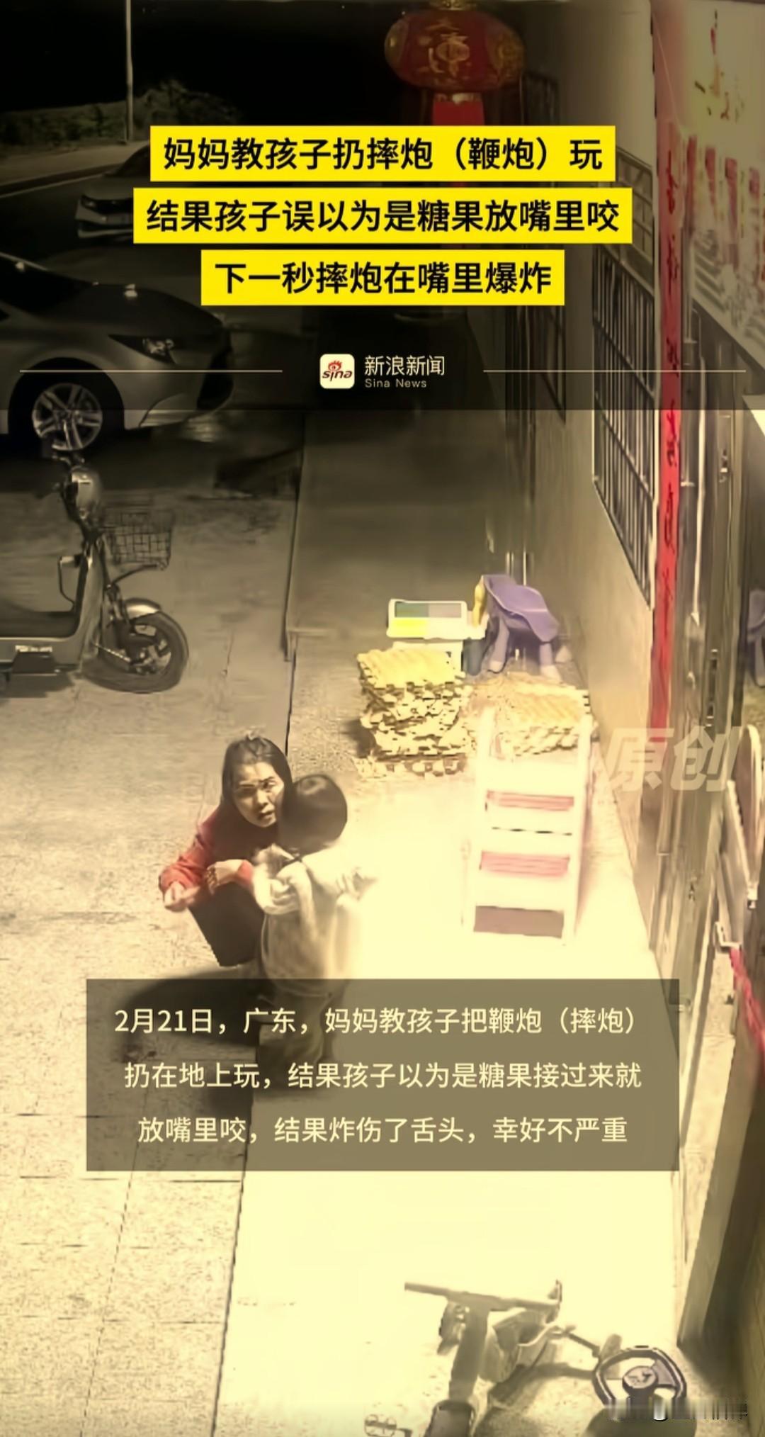 广东一娃把摔炮当糖咬,嘴里瞬间炸响!妈妈的一句话,戳中无数家长的心 2月21日,广东河源,一段监控视频看得人揪心: 一位妈妈在家门口教孩子玩摔炮扔地上玩,孩子拿了摔炮之后,妈妈转身进屋拿东西的功夫,孩子竟把摔炮当成糖果,直接塞进嘴里咬了下去。 “砰”的一声,摔炮在口腔里炸响,孩子舌头被炸伤,所幸伤势不算严重。 事后,孩子妈妈在评论区无奈回应:“道理谁都懂,就是谁也不会想到放嘴巴呀,哪怕用手捏爆也没那么害怕。” 摔炮看着“安全”,其实也隐藏着很大的风险,很多家长觉得,摔炮不用点火,往地上一摔就响,给孩子玩没什么大不了。 但真相是摔炮里的雷酸银,毒性堪比氰化物,遇挤压、摩擦就会爆炸。如果给幼童玩的话可能有以下几种后果: 口腔爆炸:会造成黏膜灼伤、撕裂伤,严重时可能影响吞咽和语言功能。 误食风险:化学物质会刺激消化道,导致黏膜溃烂、穿孔,甚至损伤肝肾。 儿童认知差:低龄孩子分不清“玩具”和“零食”,极易把摔炮当成糖果,酿成悲剧。 还有比炸伤更可怕的,是家长的“侥幸心理”,在这起意外里,最让人揪心的不是摔炮本身,而是家长那句“谁也不会想到”。 现实中,太多家长抱着类似心态: “就玩一小会儿,不会出事的。” “别人孩子都玩,我家孩子也没事。” “我就在旁边看着,不会有意外。” 可安全从来没有“侥幸”,意外往往就发生在那一秒的疏忽里。 春节带娃,这3条安全底线必须守住 1. 全程看护,绝不离开视线:孩子玩任何玩具,尤其是烟花爆竹,家长必须寸步不离,严禁让孩子单独接触。 2. 拒绝“看似安全”的玩具:摔炮、擦炮、小烟花等,看似无害,实则暗藏风险,坚决不给低龄孩子玩。 3. 反复教育,让孩子远离危险:告诉孩子“不能把东西往嘴里塞”“遇到不认识的东西要问大人”,把安全意识刻进骨子里。 最后想说: 孩子的安全,从来没有“万一”,只有“一万”。 别等意外发生,才追悔莫及。 来源:新浪新闻