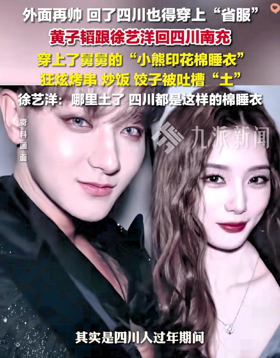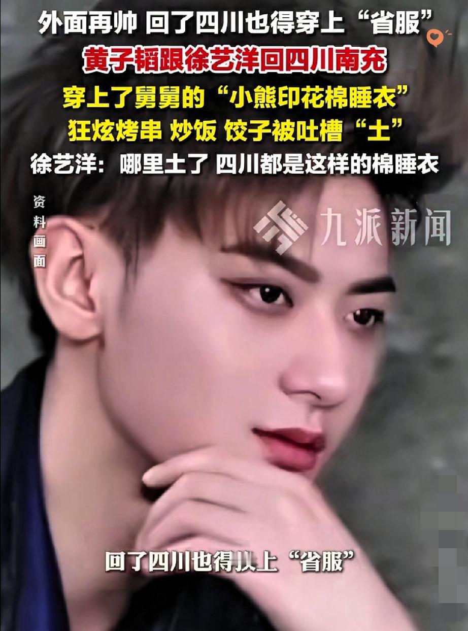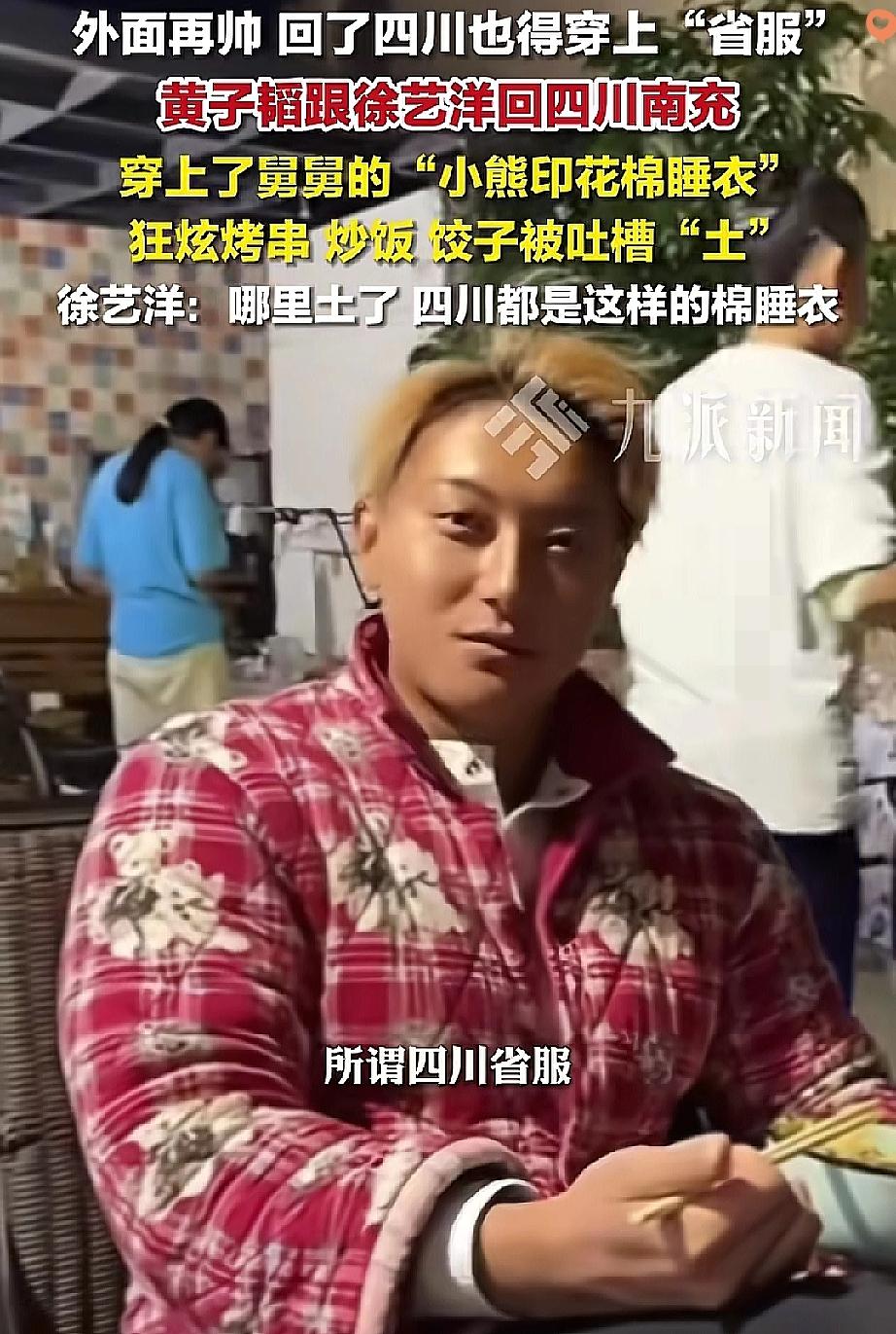黄子韬,冲上热搜! 这次不是舞台高光,而是被四川“省服”彻底拿捏了。 2月23日,黄子韬陪徐艺洋回四川南充过年,直接穿上舅舅的大花棉睡衣,瞬间卸下所有明星光环,妥妥融入当地年味。 网友笑称:再拽的明星,回川当女婿也逃不过省服“入职考验”。 有人说这身穿搭又土又丑,可我反倒觉得,这才是最真实的人间烟火。 不端架子、不搞排场,愿意穿长辈的旧衣服,踏实融入爱人的家庭,这份松弛与真诚,比任何精致造型都圈粉。 明星也是普通人,最好的状态从不是完美人设,而是自在舒服、真心待人。 你觉得黄子韬穿省服接地气吗,是不是越看越可爱?