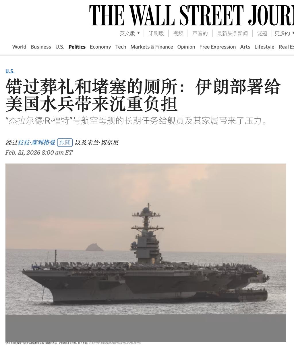 福特号航母成“大粪号航母”,美国公共广播电台(NPR)和《华尔街日报》都证实美国海军有史以来最昂贵的舰艇上爆发了“厕所大战”——连续执勤8个月的福特号航母上可用的厕所太少,导致4600名水手每天排队45分钟上厕所。 厕所不够用也就算了,连工程质量也存在问题。工程师安装了一个脆弱的真空系统,导致一个厕所的单个阀门发生故障,整个部门的所有厕所都无法正常工作,使得排队时间更长。重要的是,如果不把船送回美国船坞,就不可能修复这个系统。这些问题已经持续一年多,并且逐渐增多。比如去年3月份1,工程部门发给船上所有主管的一封电子邮件称,四天内发生了205起(厕所)故障。 现在,执勤8个月的福特号船员们经常排起长队进行“粪斗”,这被称之为“厕所大战”。污水处理人员现在每天工作 19 个小时,努力满足需求。 美国纳税人花130亿美元建造的这艘超级航母问题多多,除了众所周知的弹射器达不到预期要求,就连给船员做饭的烤箱也不可靠,五角大楼网站在去年6月10日的文章里指出“舰上有八个烤箱——这是一艘每天供应 15300 份餐食的军舰,但只有两个能用,六个都送去维修了。” 《华尔街日报》在2月21日的文章里说“第二次延长福特号航母部署的决定,给舰上的水兵及其家人带来了沉重的打击,一些人考虑在返回母港后离开海军。”文章还指出“人员超负荷运转并非福特号航母独有的问题,海军舰队其他舰艇也面临着同样的困境。”文章还指出“长期部署对舰艇本身也是一种考验。经过八个月的海上航行,设备开始出现故障。” 美伊两国将在本周四举行新一轮谈判,也许谈判结果将决定屁滚尿流的福特号航母,是否要憋着尿参加一场大战。