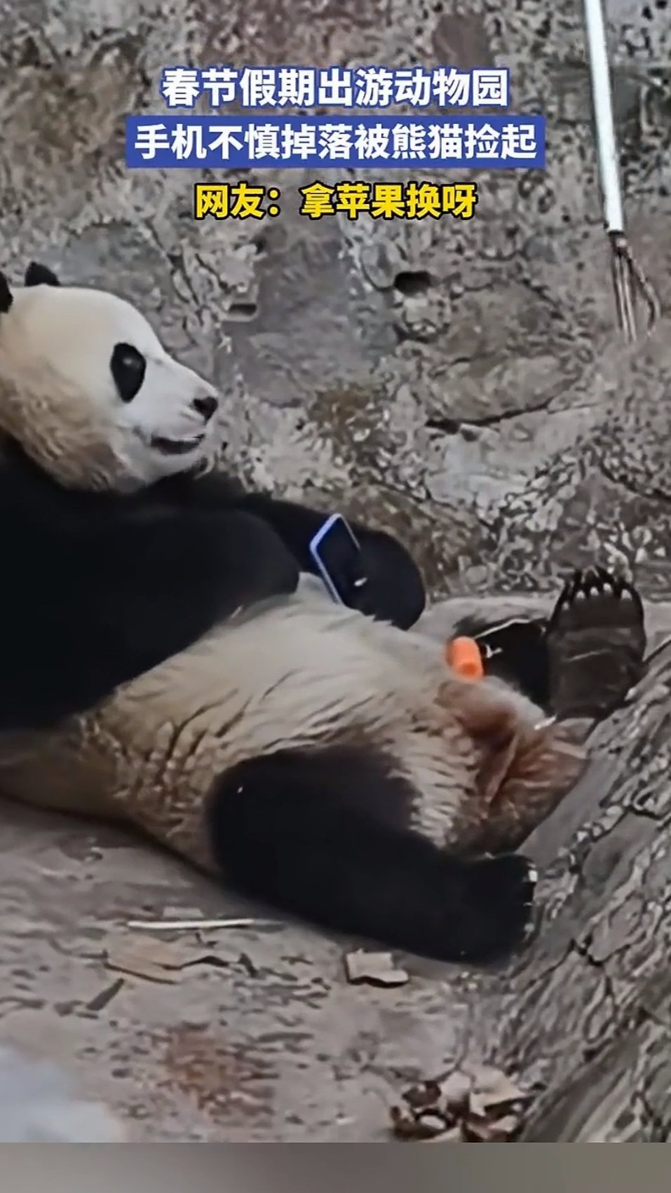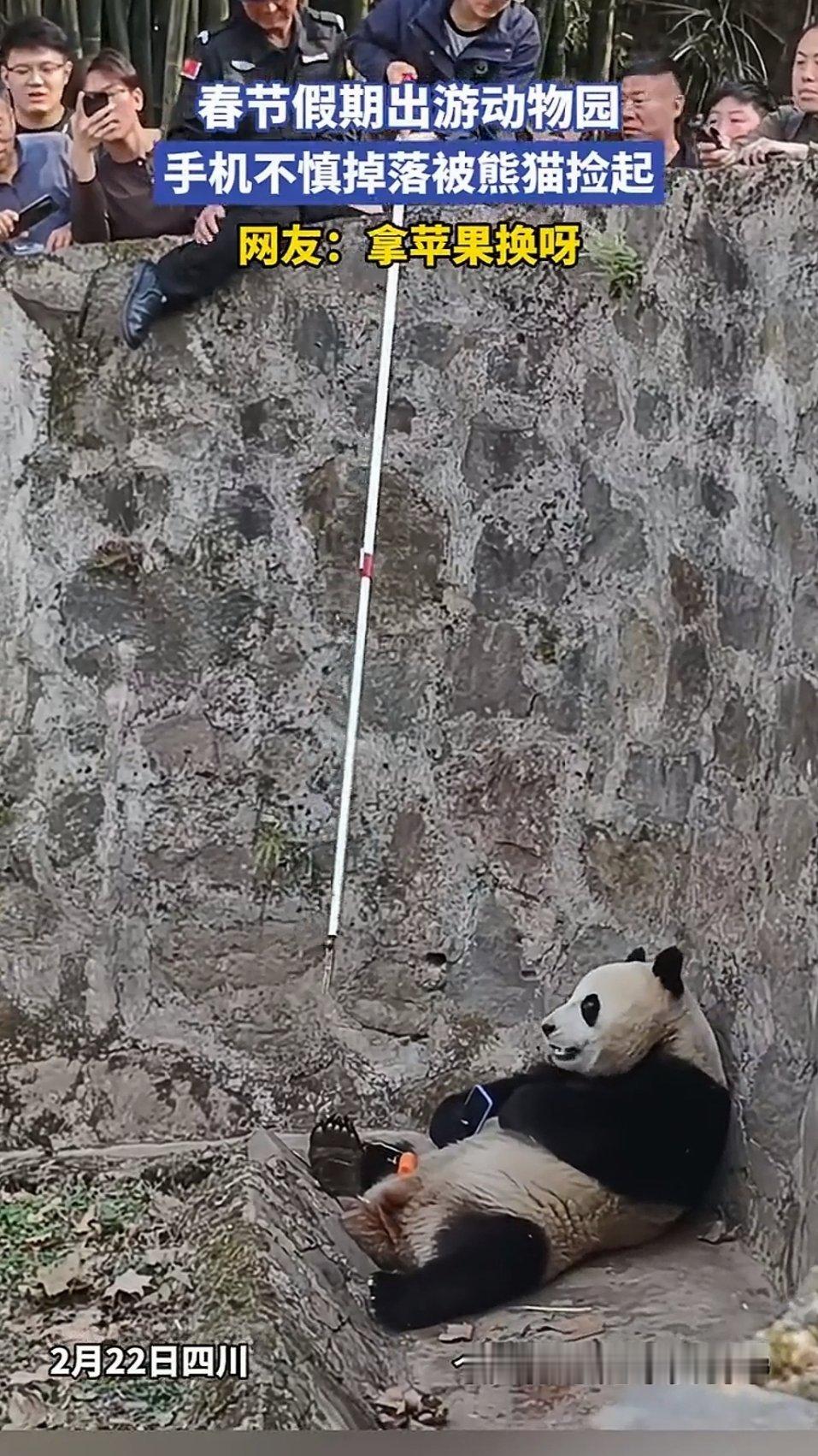 四川一熊猫捡起游客遗落手机,饲养员试图喂食吸引取回,熊猫仍紧抱不放“最后玩够了才