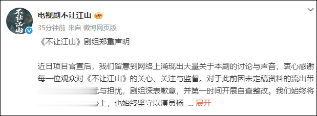 近日项目官宣后,我们留意到网络上涌现出大量关于本剧的讨论与声音,衷心感谢每一位观众对《不让江山》的关心、关注与监督。对于此前因未定稿资料的流出带给大家的相关困扰与担忧,剧组深表歉意,并第一时间开展自查整改。我们始终将观众的期待放在心上,也始终坚守以演员杨洋饰演的男主李叱为核心的创作初心,全力守护角色的完整与鲜活。