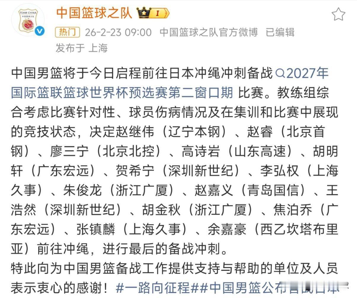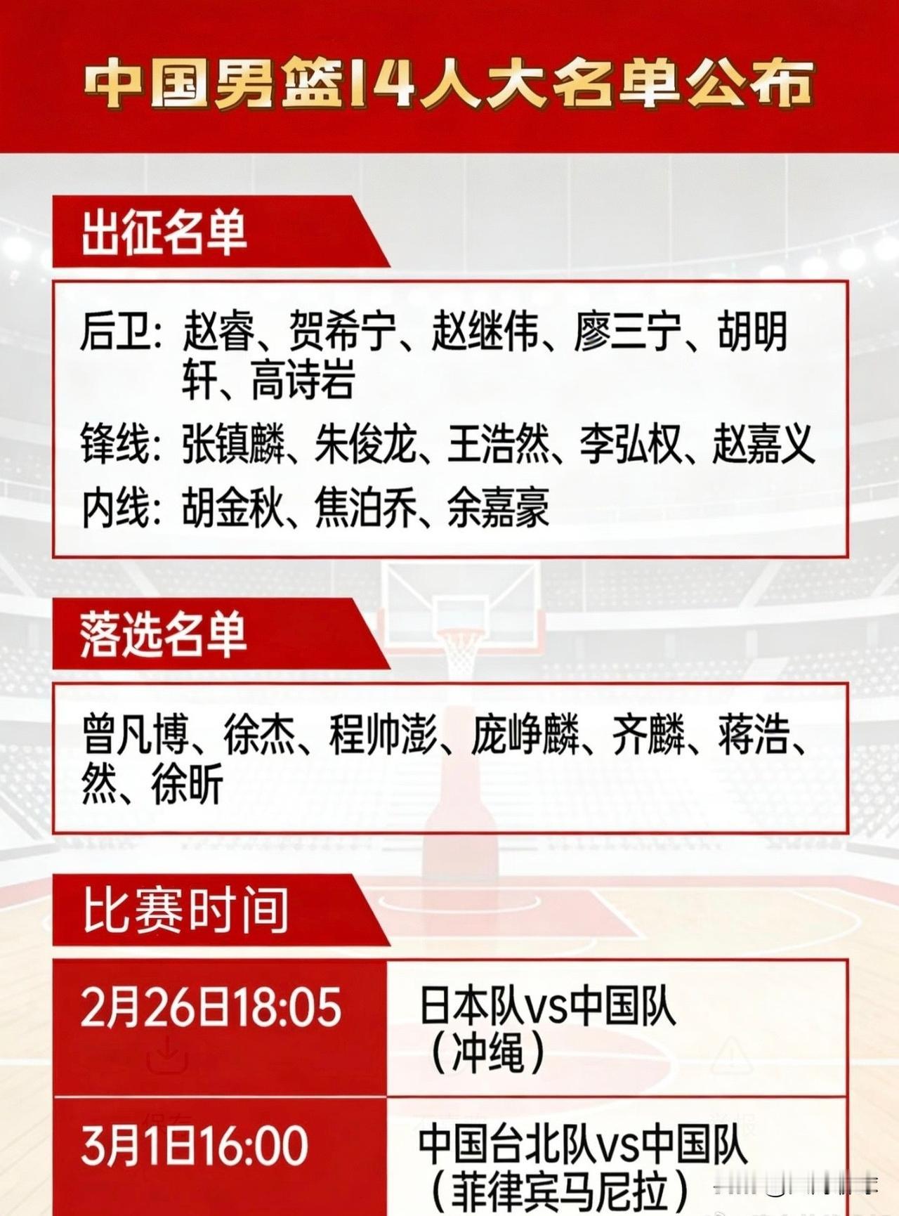 中国男篮生死战弃用庞峥麟、齐麟,曾凡博伤退,余嘉豪驰骋万里“琉球”汇合!大名单仅保留14人,赵睿、赵继伟、胡金秋领衔,值得一提的是高诗岩、赵嘉义、焦泊乔再次入选,让球迷们产生了质疑,面对日本“小快灵”的打法,期待此次中国男篮的出色发挥!