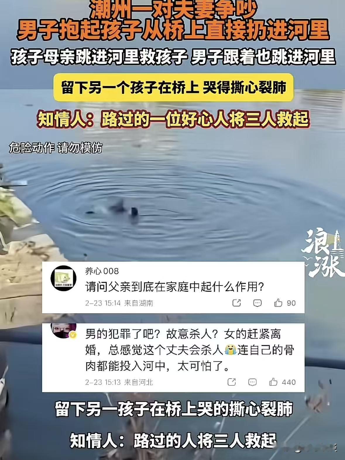 “摊上这么个爹!”广东潮州,一对小夫妻带着孩子遛弯,走到一个桥上时,不知道因为什么发生争吵,男的竟然直接情绪失控,把怀里不满一岁的孩子从桥上扔到河里,大家都不理解,那可是他的亲骨肉,怎么就狠得下心做出这种事! 2026年2月23号下午,一对二十来岁的小夫妻带着两个孩子溜达。 大的儿子有四五岁,小的宝宝才几个月,被爸爸抱在怀里。 一开始一家人在桥上走着,看着还挺平和的,谁也没想到转眼就出事了。 起初俩人不知道因为什么只是低声互相埋怨,说着说着语气就越来越冲,声音越吵越大。 不知道女方哪句话戳到了他,这男的瞬间脸涨得通红,眼神都变了,整个人跟疯了似的。 他怀里还抱着孩子,没有半分犹豫,双手抓着孩子的小胳膊,猛地就往桥外甩了出去。 孩子“扑通”一声掉进了河里,溅起一大片水花,那一幕,让周围所有人人心脏都跟着揪紧。 孩子妈妈当时直接就傻在了原地,眼睛直勾勾地盯着孩子落水的河面,整个人僵住。 也就一两秒的功夫,她突然发出撕心裂肺的哭喊,声音都喊破了音。 那是作为母亲的本能,眼里心里只剩下水里的孩子。 她什么都顾不上了,连鞋子都没脱,扒开身边围观的人,纵身就从桥上跳了下去。 哪怕河水再深、水流再急,也挡不住她救孩子的决心。 而那个亲手把孩子扔下去的父亲,看着老婆跳河的瞬间,愣了一下,估计是也慌神了,迟疑了几秒,也跟着跳了下去。 只是他的心思,没人能看透,到底是真的回过神来想救人,还是怕事情闹大,自己要承担可怕的后果,谁也说不清楚。 桥上就只剩下那个四五岁的大儿子,孩子吓得嗷嗷大哭。 在桥上跌跌撞撞地乱跑,一边跑一边哽咽着哭喊救妈妈、救弟弟,那稚嫩又绝望的声音,听着让人心都碎了。 万幸的是,人间自有真情在,现场的路人没有一个冷眼旁观,所有人都第一时间忙着救人。 有个热心大哥,一看这情况,赶紧跑到桥边的草丛里,扒拉着找了一根粗木头。 使出浑身力气扔到河里,扯着嗓子喊让落水的两个大人抓住,千万别被水流冲走了。 还有两个年轻小伙,二话不说,扯掉外套就往河里跳,朝着一家三口的方向游过去。 河里的水一点都不浅,水流还挺急,俩人游的时候好几次都被水流冲得打晃,差点站不稳,可他们还是咬牙朝着目标靠近。 桥上的人也都没闲着,有人立刻掏出手机报警,有人趴在桥边,一边盯着河里的情况,一边大声给救人的人加油鼓劲。 还有心软的路人,蹲下来抱住那个吓傻了的大儿子,轻轻拍着他的后背,一遍又一遍地安慰: 别怕别怕,爸爸妈妈和弟弟都会没事的,大家都在救他们,一定会平安的。 那一刻,素不相识的陌生人,因为一场意外,拧成了一股绳,只为了救那三条命。 好在所有人的努力都没有白费,在大家的合力救助下,小婴儿被最先救上了岸。 随后,孩子妈妈和那个狠心的父亲也被先后救上了岸。 孩子妈浑身都湿透了,头发一缕缕贴在脸上,脸上全是泪水和河水,一上岸就紧紧抱着失而复得的孩子嚎啕大哭。 一边哭一边对着那个男的破口大骂,情绪彻底崩溃,任谁过来劝,都劝不住。 她的恐惧、愤怒、绝望,全都在哭声里。 而那个男的,上岸后就蹲在一旁的地上,头埋得低低的,一言不发。 身上也湿淋淋的,不知道是被河水冻的,还是因为自己做的错事感到害怕。 现场的路人看着他这副样子,气不打一处来,有人忍不住指责,说他根本不配当爹,连自己的亲生孩子都能下手。 没过多久,民警就赶到了现场,了解情况后,当场就把男子带走。 同时安抚着情绪崩溃的孩子母亲,一边安排人员将几人都带回了派出所,做进一步的调查和处理。 《刑法》第232条:故意杀人的,处死刑、无期徒刑或者十年以上有期徒刑。就算情节较轻的,也得处三年以上十年以下有期徒刑。 男子明知道桥下是河水,孩子才几个月大,根本没有自救能力,掉进河里大概率会淹 死,却还是故意把孩子扔下去,主观上就有伤害孩子生命的故意。 只不过因为路人的及时相救,孩子没有死亡,这属于故意杀人未遂,即便如此,他依然要承担刑事责任。 只是量刑的时候会比故意杀人既遂轻一些,但就算是最轻,可能最少也会判三年以上有期徒刑。 毕竟他的行为,已经严重危害到了孩子的生命安全,性质极其恶劣。 这件事越想越让人觉得气愤又后怕,夫妻之间过日子,哪有不吵架的,谁家没有点鸡毛蒜皮的小事? 有矛盾、有分歧,坐下来好好沟通、好好解决就够了,就算再生气、再激动,也不能拿孩子撒气。 孩子是无辜的,他们来到世上,是被父母疼爱的,不是被当作情绪发泄的工具的。 那可是自己的亲生骨肉,是从自己身上掉下来的肉,几个月大的宝宝,什么都不懂,他有什么错。 就因为大人之间的矛盾,就要承受这样的生命危险,想想都让人觉得心疼。 对此,你怎们看这个男子把孩子扔到河里这件事! @静心法谈 学法辨是非,慬法不吃亏。