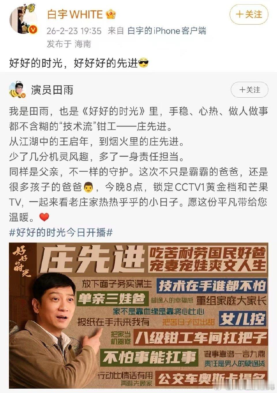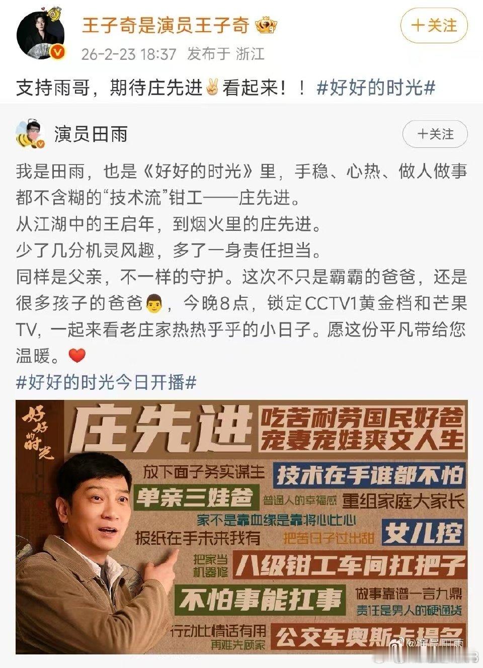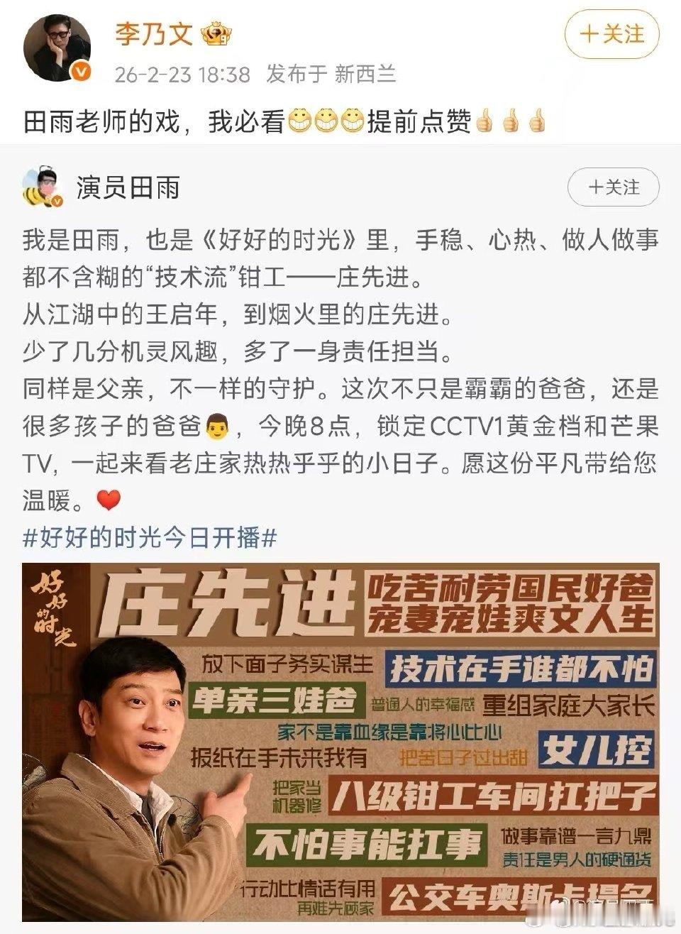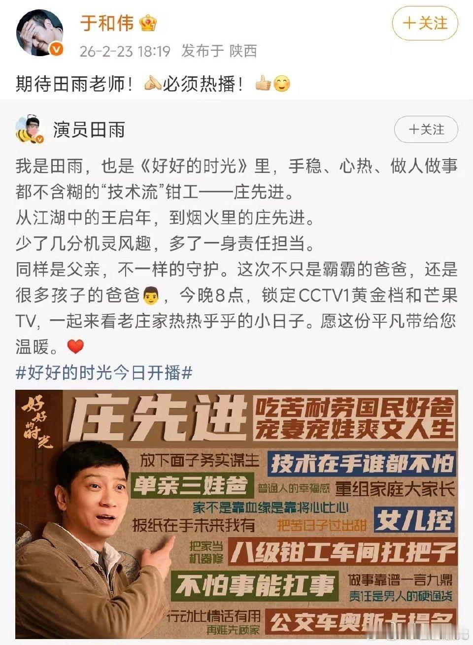 田雨内娱人缘 田雨新剧一开播,朋友圈直接刷屏。黄渤于和伟李乃文倪妮白宇,全跑来送祝福。这种待遇不是谁都能有的,田雨这人缘属实硬核。