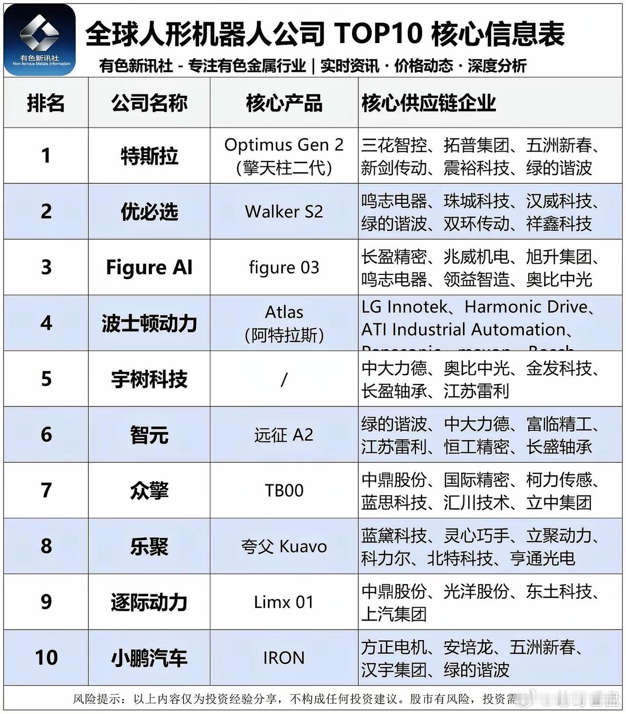 人形机器人TOP10供应链曝光。一张“全球人形机器人TOP10核心供应链”名单今日引发市场高度关注。榜单显示,特斯拉Optimus、优必选Walker、Figure 03等全球头部机型背后,站着一批A股核心供应商。绿的谐波同时为特斯拉、优必选、智元三家供货;三花智控、拓普集团绑定特斯拉;中大力德、鸣志电器、奥比中光等多股覆盖宇树、Figure等多家整机厂。从减速器、电机到传感器,国产供应链已深度渗透全球人形机器人产业核心环节。