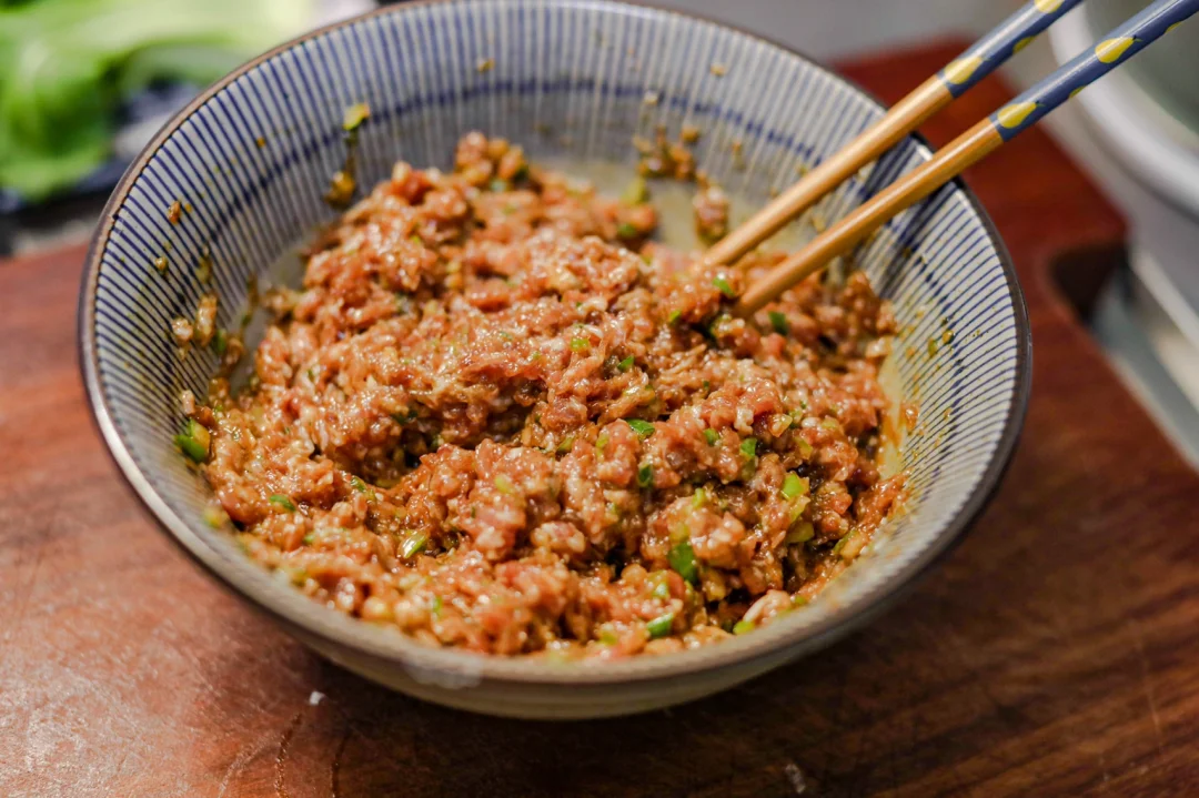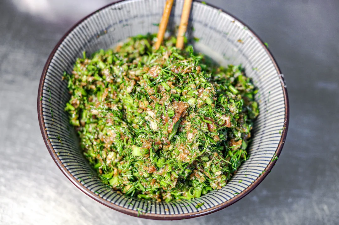 🌻茴香清洗干净,切成颗粒,待用。猪前腿肉用刀剁成肉末,加入葱姜,生抽,蚝油,食盐,白糖,料酒,食用油和芝麻香油,搅拌均匀,加入茴香即可。