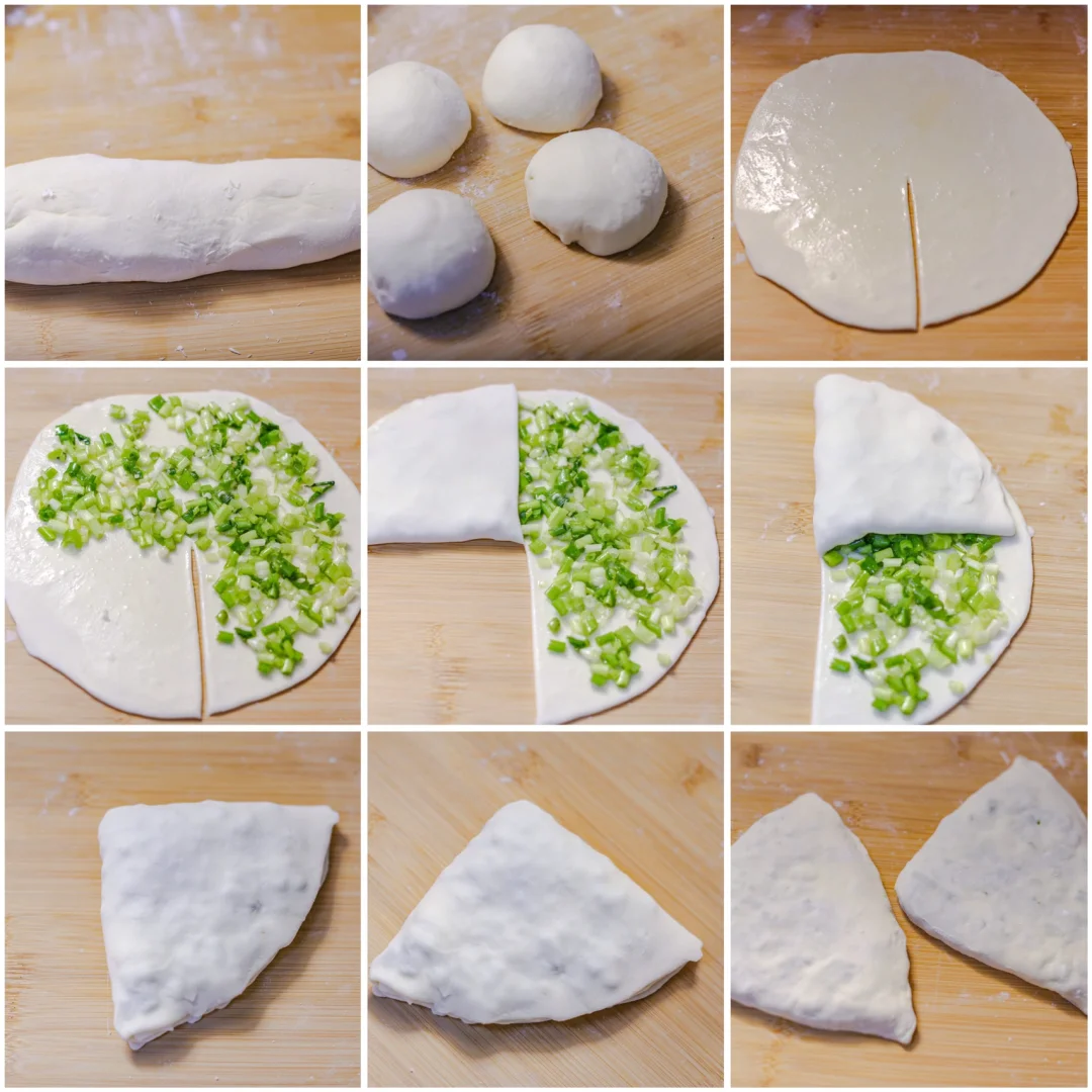 ✨5.撒上一些手粉,擀成直径30厘米左右的圆形,然后用刀在底部划上一个口,把葱花铺在上面,然后叠成一个扇形,把周边的口封住即可。(见图示)