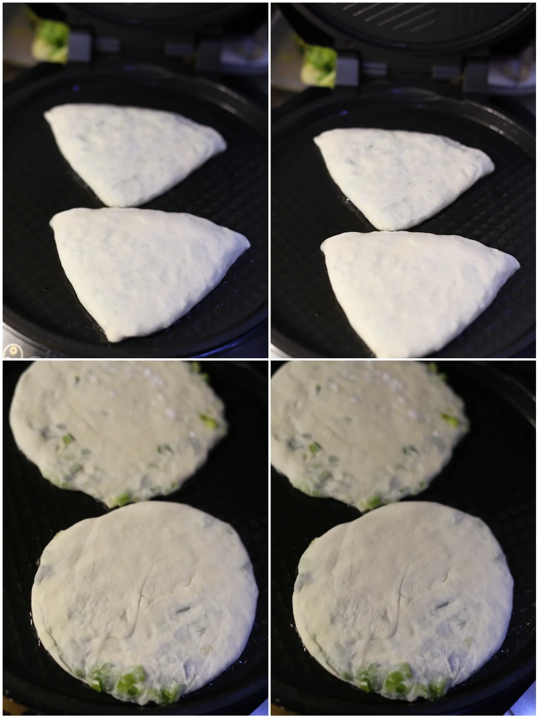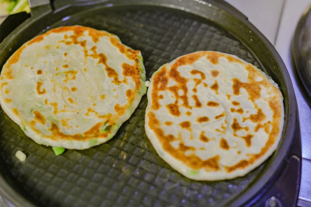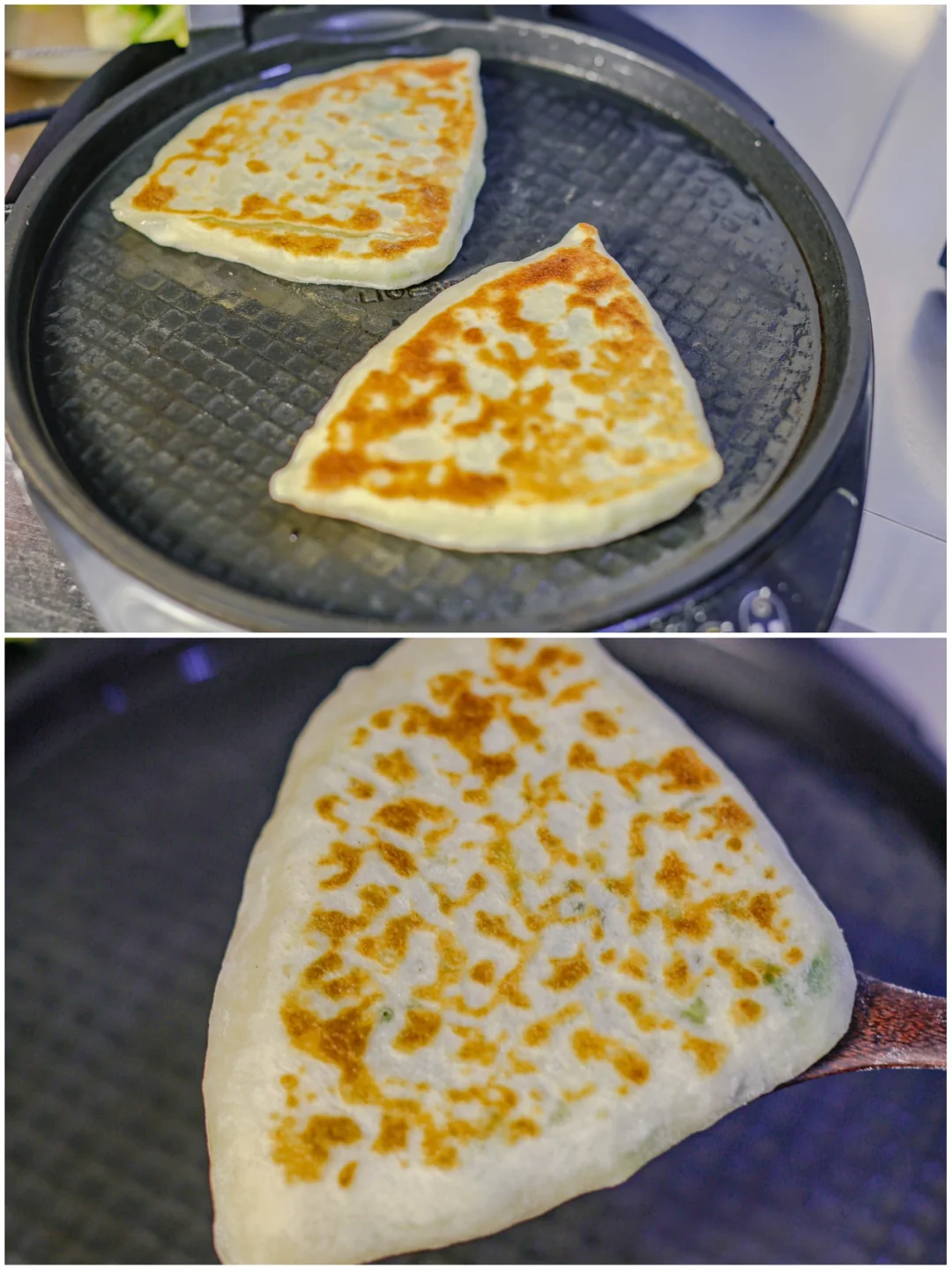 ✨6.电饼铛或者平底锅加入食用油,把做好的生饼胚放入锅中,小火烙制两面金黄即可。每面大约在3-4分钟。