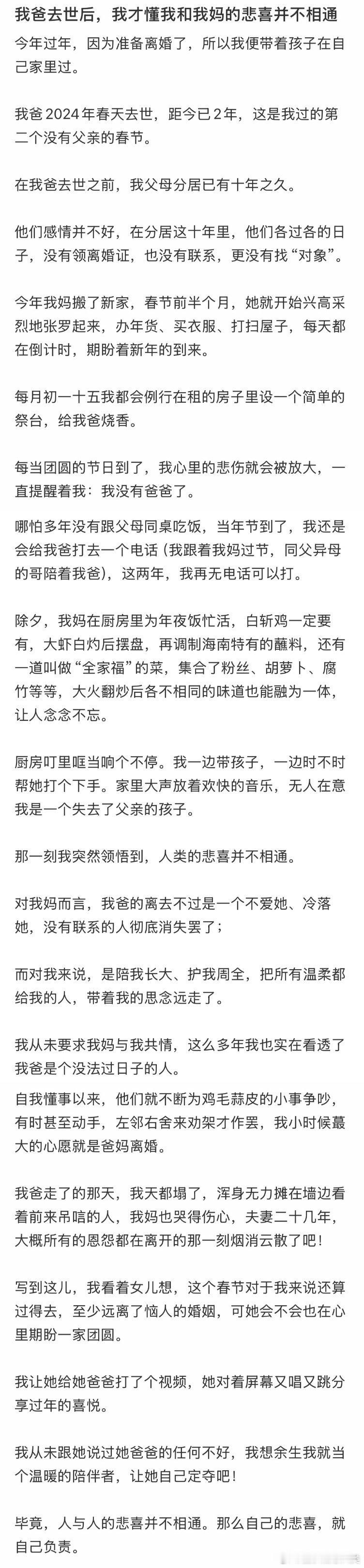 在我爸爸去世后,我才明白我和妈妈的喜怒哀乐并不相同。