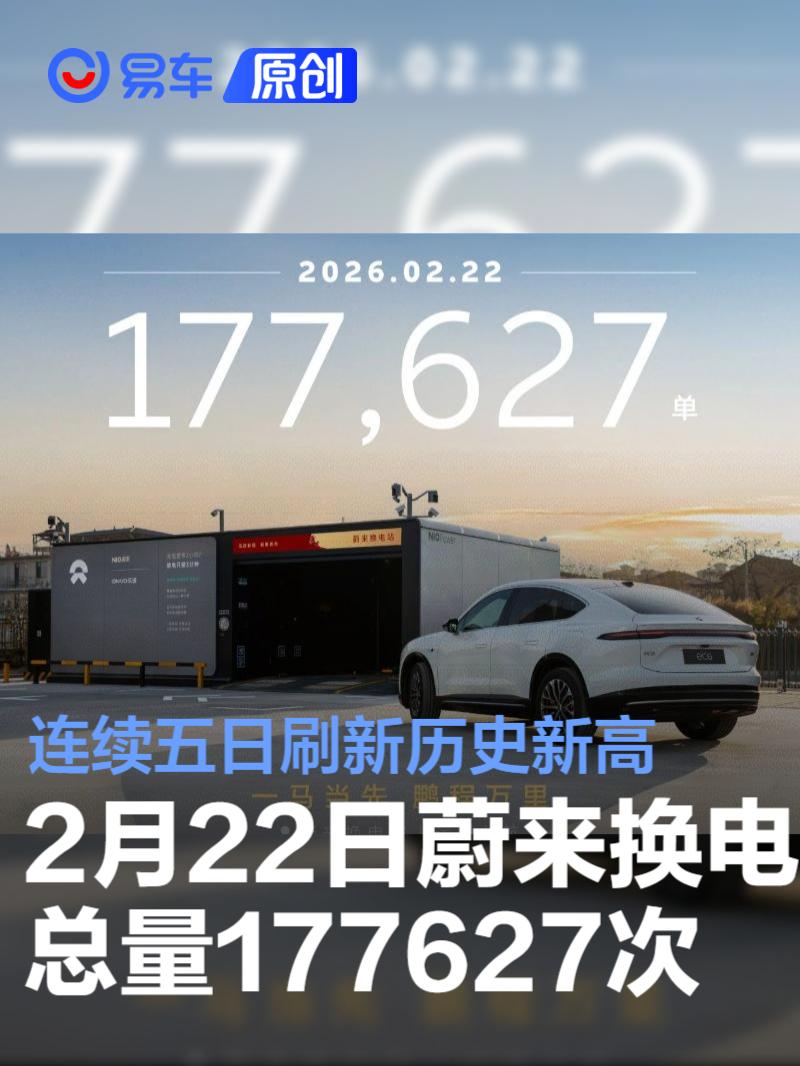 易车讯2月23日,蔚来官方宣布2026年2月22日大年初六,蔚来换电单日总量达177,627次,又创历史新高,平均不到0.5秒就有一台车完成换电!马年新春以来,已连续五日刷新历史新高。