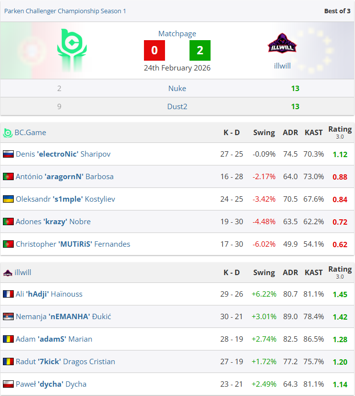由Oleksandr"s1mple"Kostyliev率领的队伍在BO1循环小组赛中以3胜2负的战绩从B组出线,期间输给了Sashi和illwill。而illwill在季后赛败者组中再次扮演了搅局者的角色,凭借在Nuke上的压倒性胜利(13-2)和Dust2上的强势进攻取胜(13-9),将BC.Game早早送出了这场丹麦线下赛。