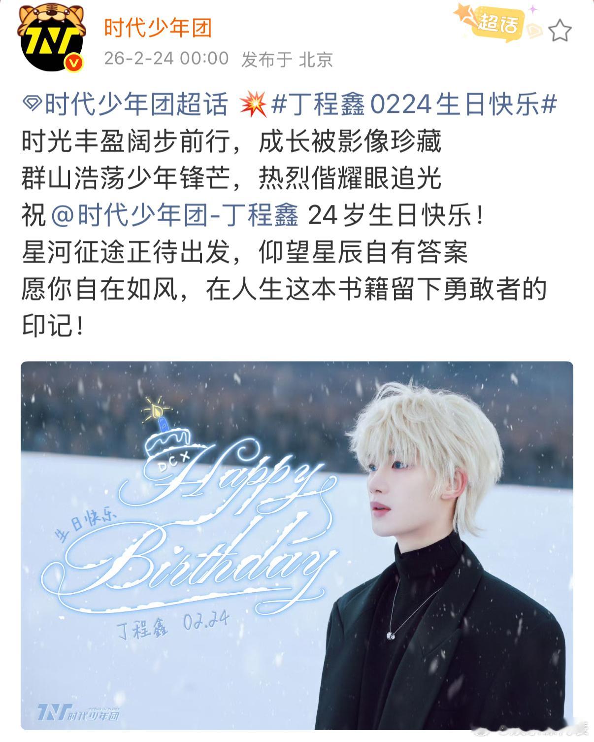 时代少年团给丁程鑫庆生:“时光丰盈阔步前行,成长被影像珍藏群山浩荡少年锋芒,热烈偕耀眼追光祝24岁生日快乐!星河征途正待出发,仰望星辰自有答案愿你自在如风,在人生这本书籍留下勇敢者的印记!”