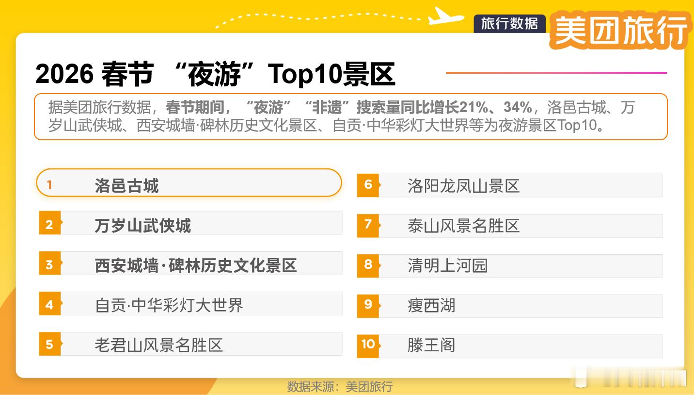 【2026春节夜游Top10景区名单来啦!河南洛邑古城位居全国第一】2月23日,美团发布《2026春节消费洞察报告》,总结春节假期文旅消费成绩单。其中,洛阳3家景区上榜春节期间夜游景区Top10。洛邑古城位居全国第一。美团数据显示,春节期间,全国“夜游”“非遗”搜索量同比增长21%、34%。洛邑古城、老君山风景名胜区、洛阳龙凤山景区上榜春节期间夜游景区Top10。其中,洛邑古城位居第一。高速