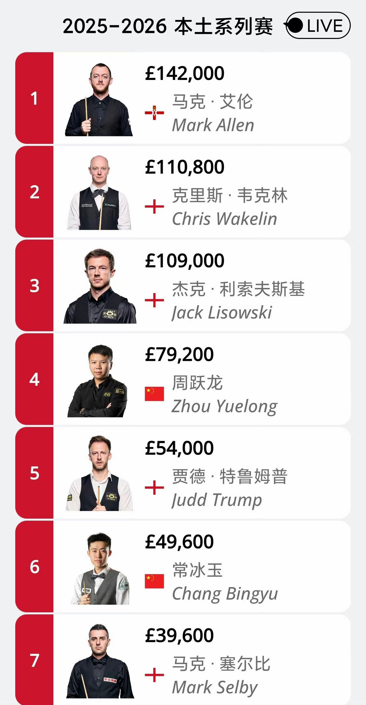 2-4!2026斯诺克威尔士公开赛,艾伦首轮出局,15万英镑大奖有点悬! 威尔士公开赛冠军奖金10万英镑,亚军4.5万英镑,64强3600英镑。 由于艾伦2-4不敌格雷斯止步首轮。如果特鲁姆普、周跃龙、常冰玉夺冠,或者韦克林和利索夫斯基打进决赛,将拿到冠军10万+额外15万英镑大奖。 难度还是挺大的,短局制容易爆冷。