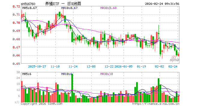 养殖ETF(516760)业绩比较基准为中证畜牧养殖指数收益率,管理人为平安基金管理有限公司,基金经理为翁欣,成立(2021-03-04)以来回报为-34.09%,近一个月回报为-2.79%。