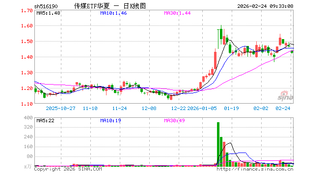 2月24日,传媒ETF华夏(516190)开盘跌1.98%,报1.436元。传媒ETF华夏(516190)重仓股方面,中国中免开盘跌7.02%,分众传媒涨0.14%,巨人网络跌0.05%,恺英网络跌0.16%,蓝色光标涨2.05%,昆仑万维涨1.67%,三七互娱涨1.11%,利欧股份涨2.46%,光线传媒跌14.99%,神州泰岳涨1.15%。