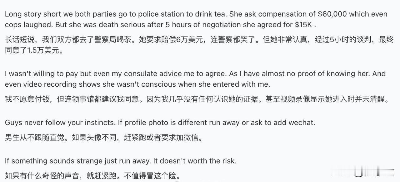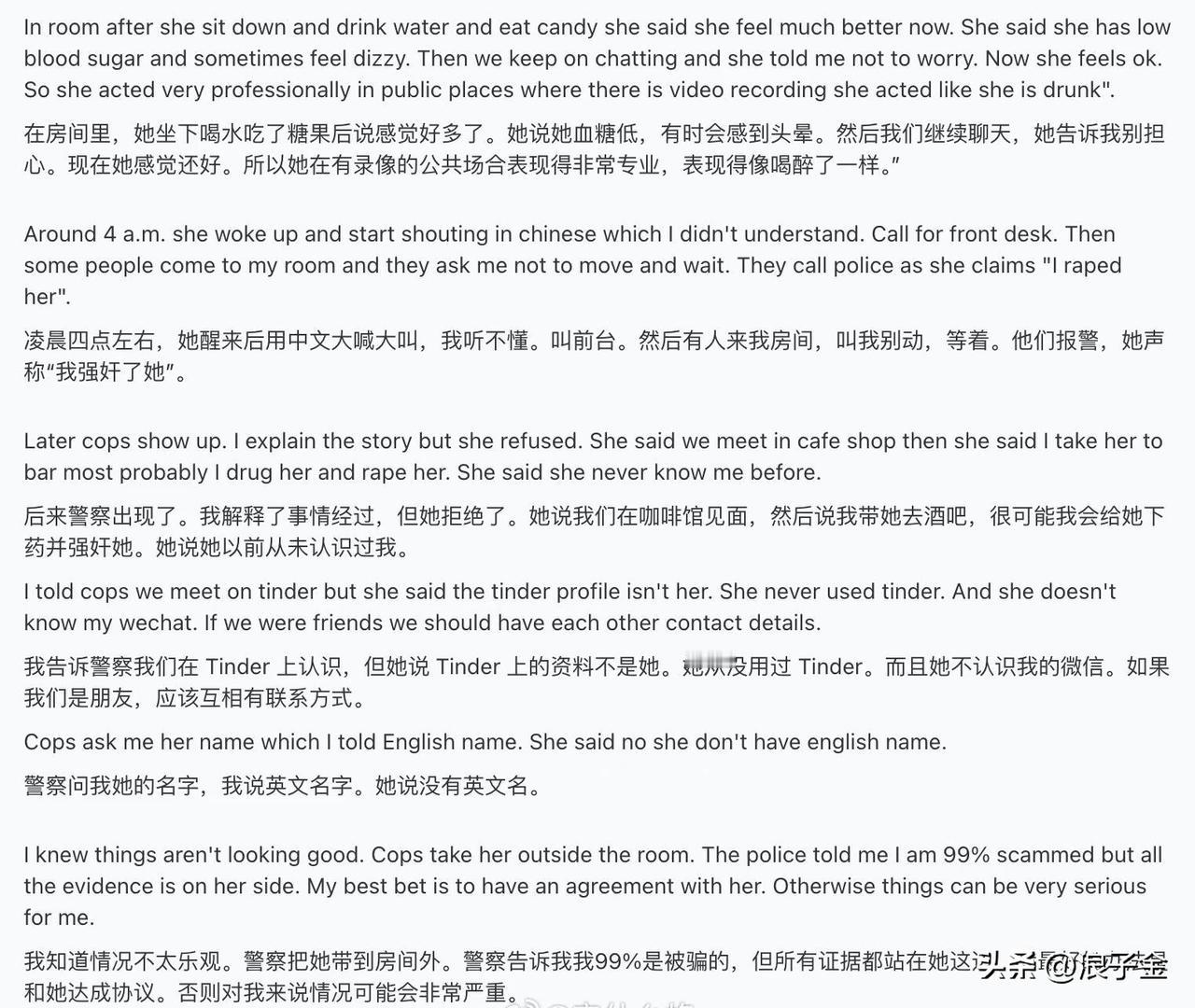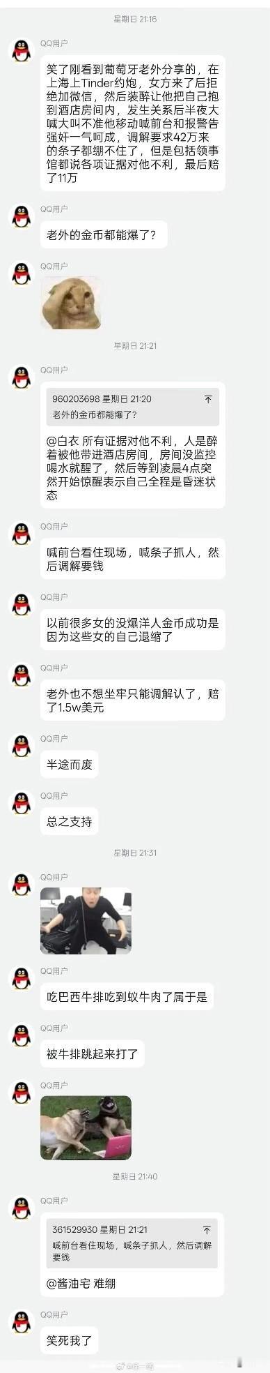 笑喷了,葡萄牙老外在上海约了个美女,结果美女拒绝加微信,假装装醉,然后半夜大喊大叫说自己被强了,要求给42万元调解费,老外找了自己国家的领馆都没用,最后被硬生生爆了11万,老外气不过,转头就外网发帖控诉。 不过老外也不冤枉,毕竟所有证据都对他不利,人是他约的,也是他主动的,期间没有任何证据表明是自愿的。 不得不说,这女子也是人才,竟然活学活用,用几句蹩脚的英文就崩了老外,而且爆金币了。 老外长点记性吧, 现在懂英文的女人不是你随便能拿捏的了。 因为现在有些美女都不蹭本地人了,专崩老外了!
