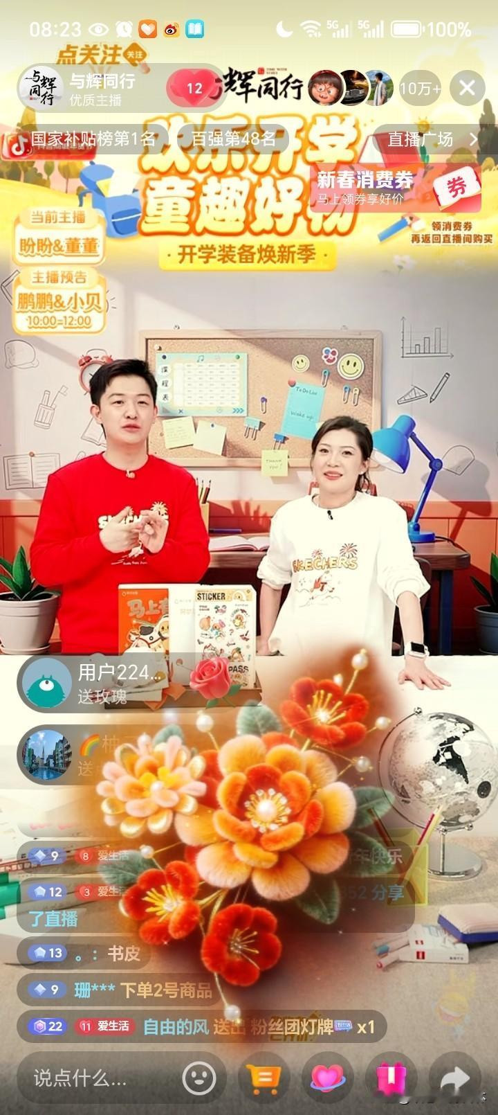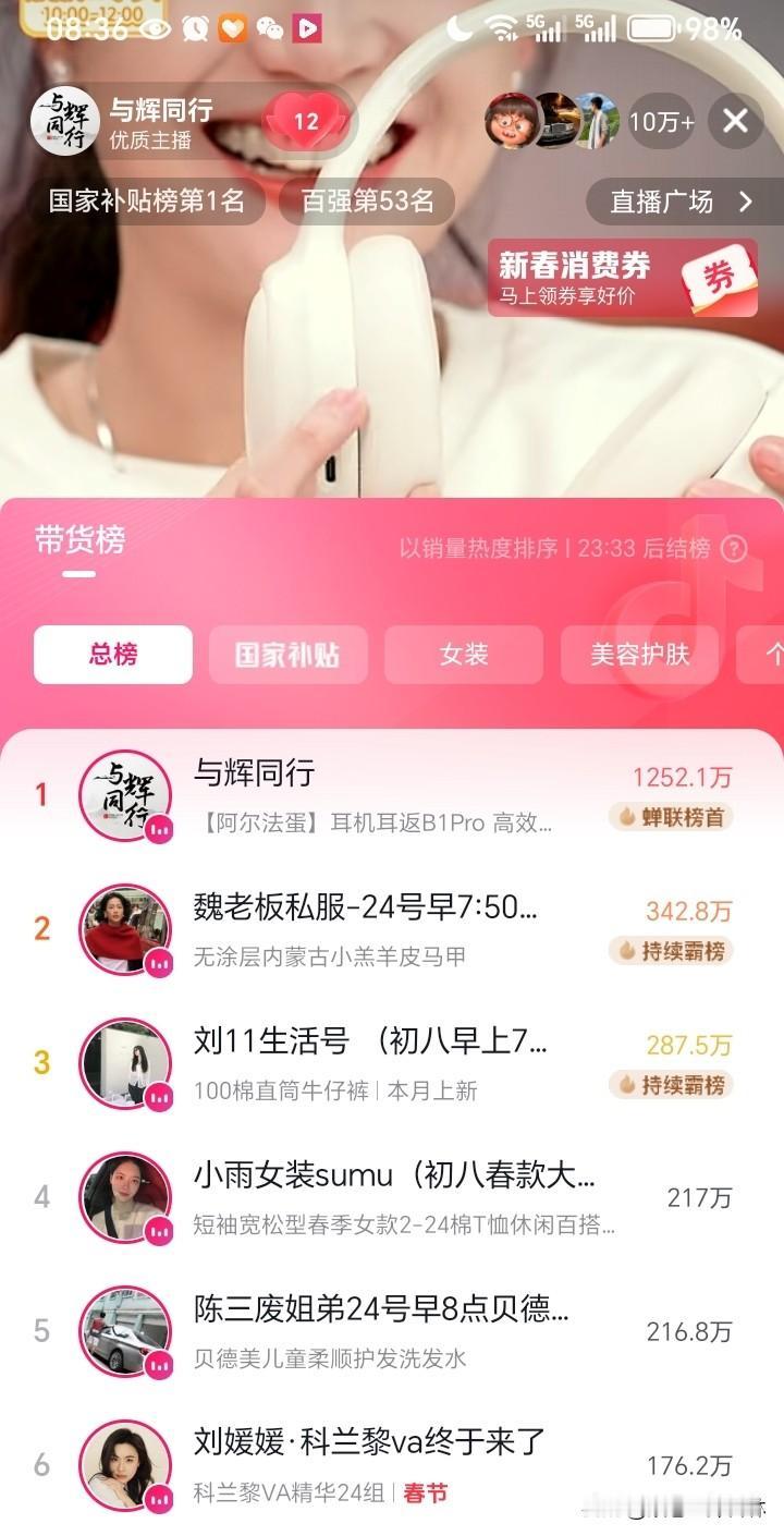 大年初八,丈母娘报复性消费。 与辉同行年后复工第一天 ,董董和盼盼组合与大家最先见面,主要讲的品是大家呼声高的学习用品,因为有宝妈留言孩子马上开学学习用品还没有买。 开播10万+大军涌入直播间,忙着买必需品,盼盼也是现场在水瓶上作画讲解画笔,经济又实惠的价格马上热卖。 开播不到一小时,直播间已经销售金额已经达到1252.1万元。 这次与辉同行提前放假,也是初八才开工, 信赖宇辉家的消费者已经等得摩拳擦掌,无论外面如何纷纷攘攘,丈母娘始终相信董宇辉,董宇辉也从来没让大家失望。